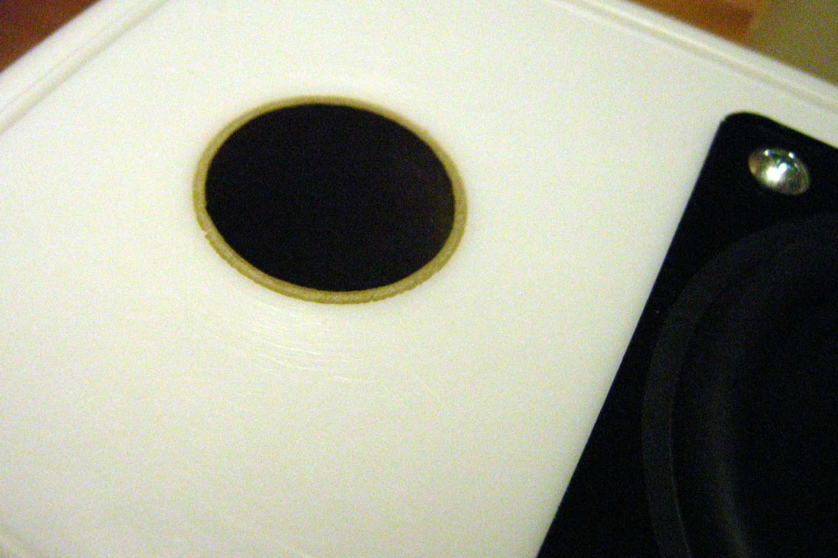 で、しばらくは、そのまま後方簡易バスレフ型(?)で運用していたのだが、この度、めでたくラップを使い終わり「ラップの芯」という名のバスレフダクトが入手できたので、早速、エンクロージャの前方に穴を空け、バスレフ型での試験運用を開始するのである。