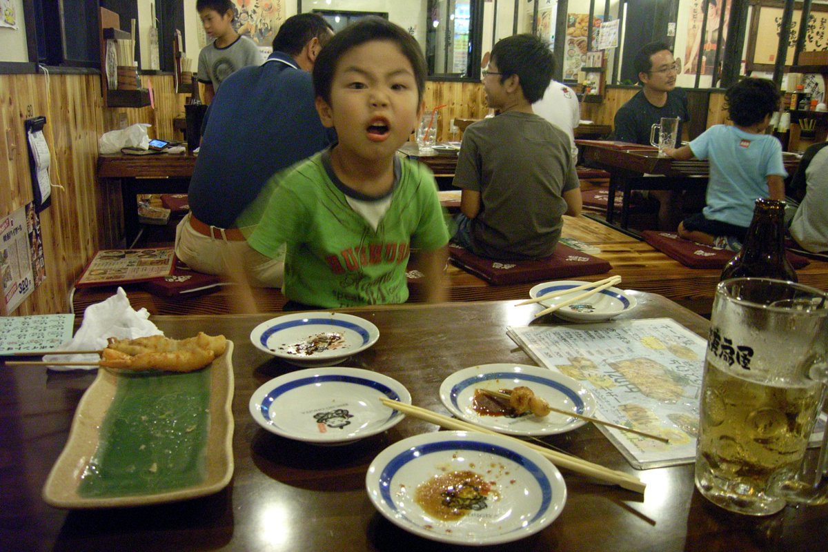 夕方、風呂で汗を流してから、5歳のガキをつれて、近所の焼鳥屋に行く。実は2回目だ。5歳のガキを居酒屋につれていくなんざ、なんてぇヤクザな親だ、と思われるかもしれない……んが、しかし、この居酒屋、むしろ子連ればかりなのであり、実のところ「焼鳥ファミレス」なのである。オッサン同士で行ったら、むしろ浮くくらいに子供だらけ。タバコの煙が漂ってくると、こんな場所でタバコを吸うなんてッ!! と……思わず居酒屋であることすら忘れてしまうくらいの雰囲気なのである。