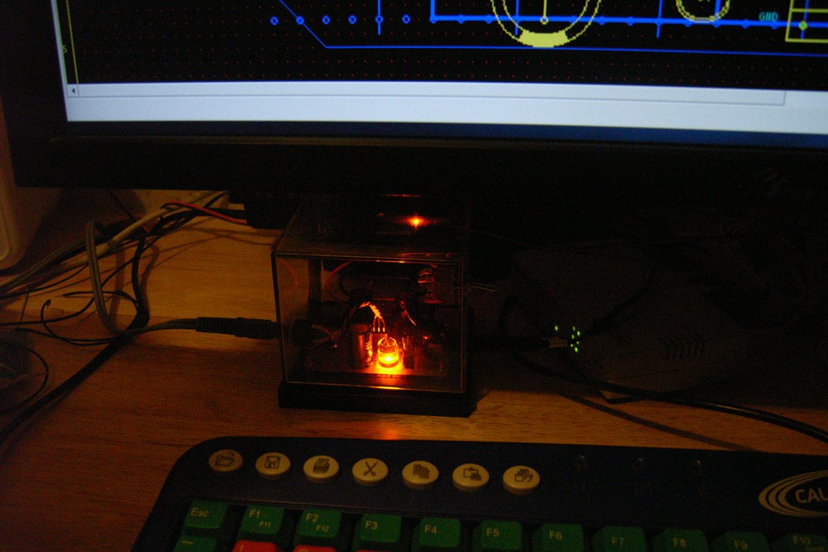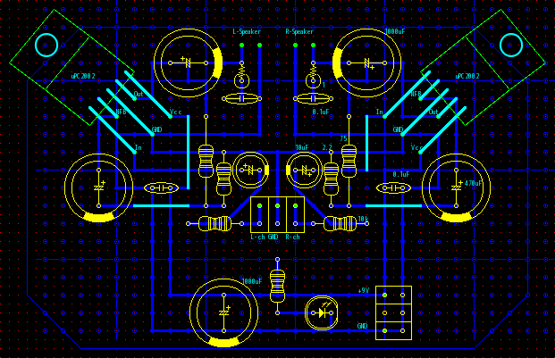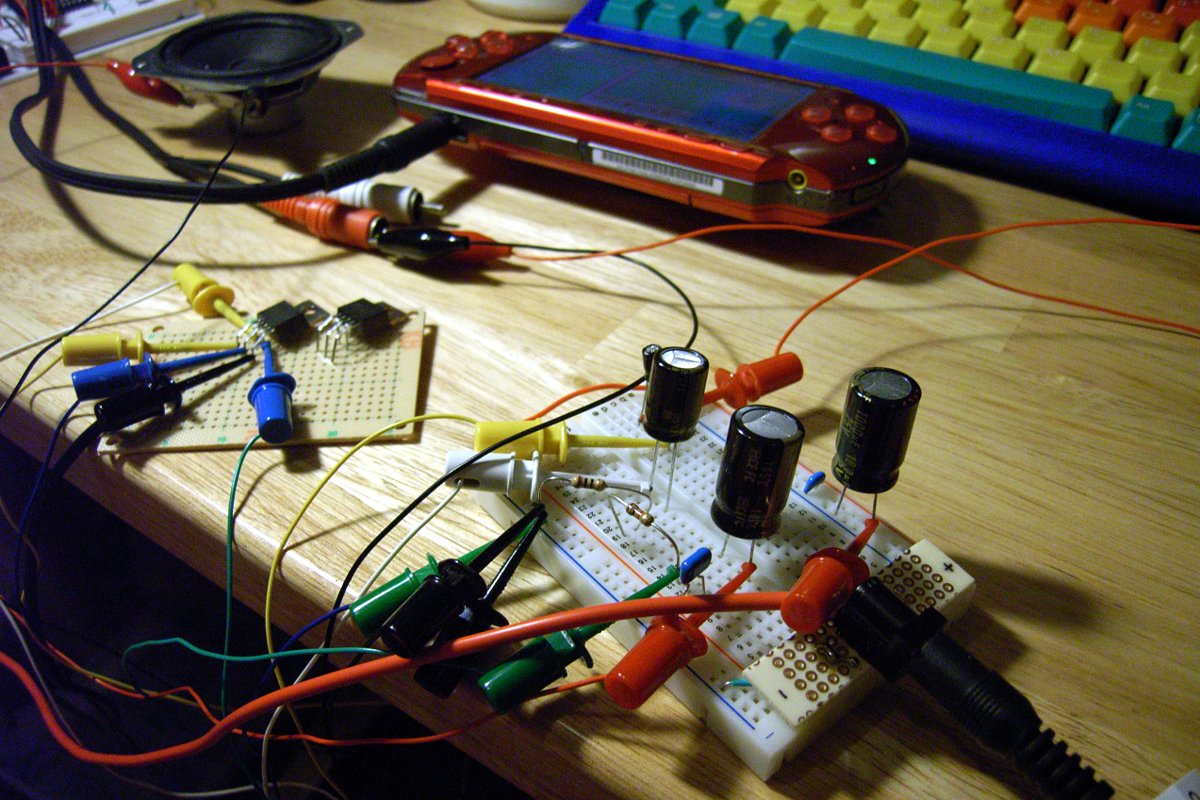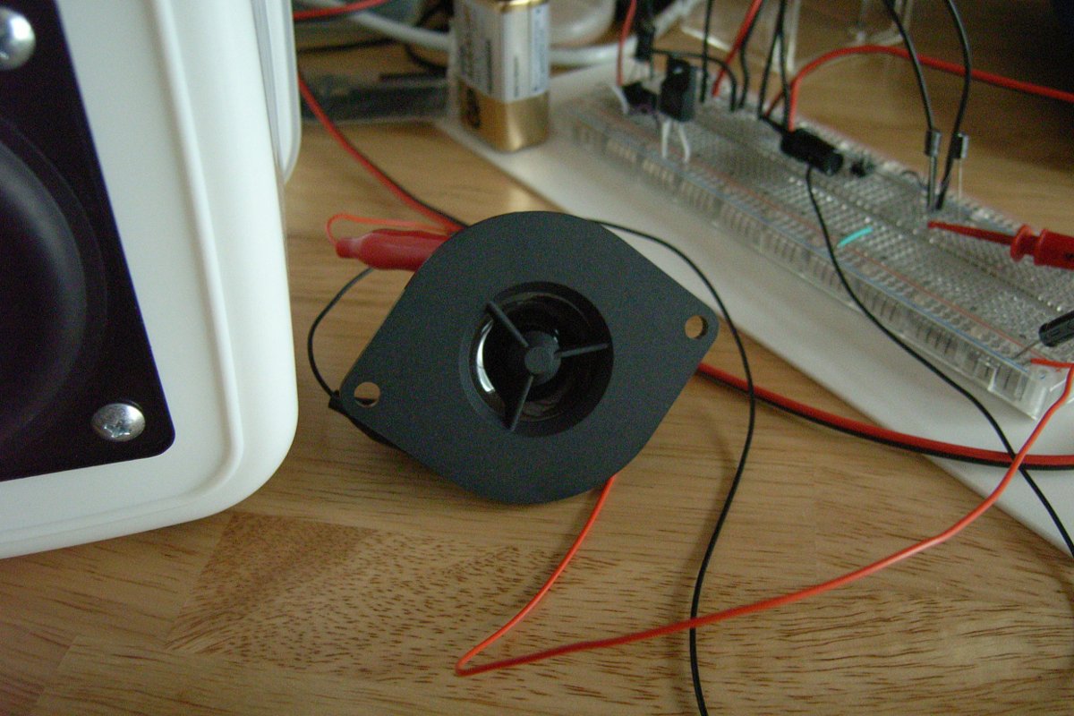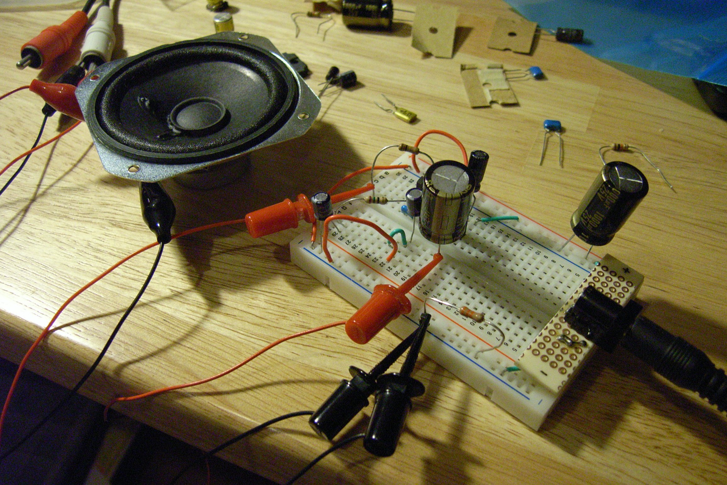 まずは、音が大きすぎ。アンプの設定ゲインが高すぎるのが原因。入力の前段に可変抵抗をつけるなどの対策が必要だ。また、MP3プレイヤをつないだ限りでは問題ないのだが、PCの出力を入れるとノイズが乗る上に、音が途切れ途切れになる。原因不明。