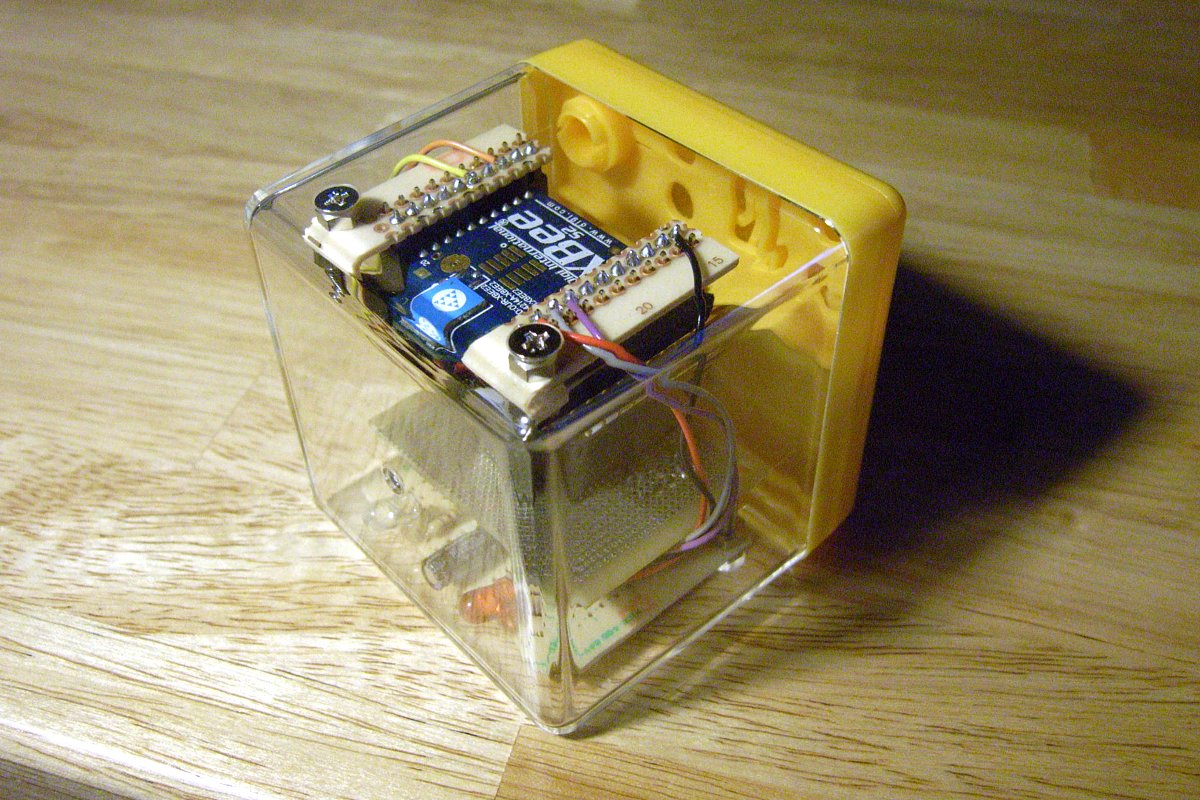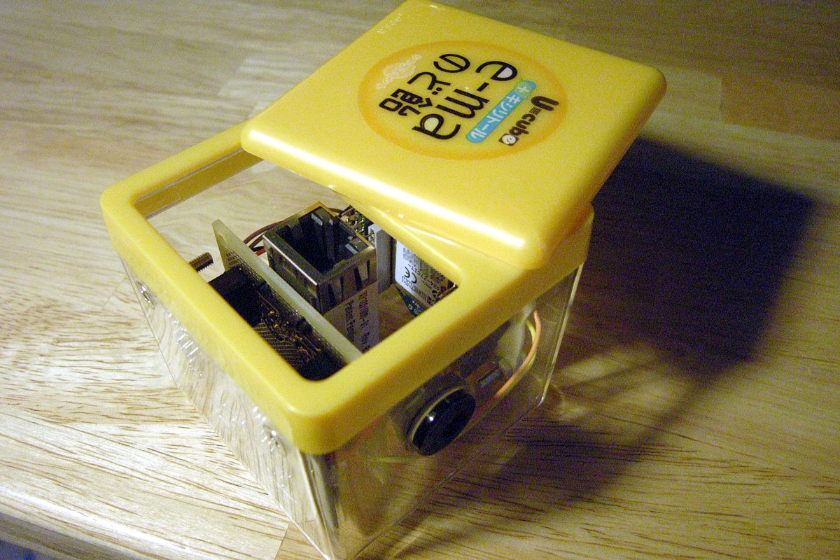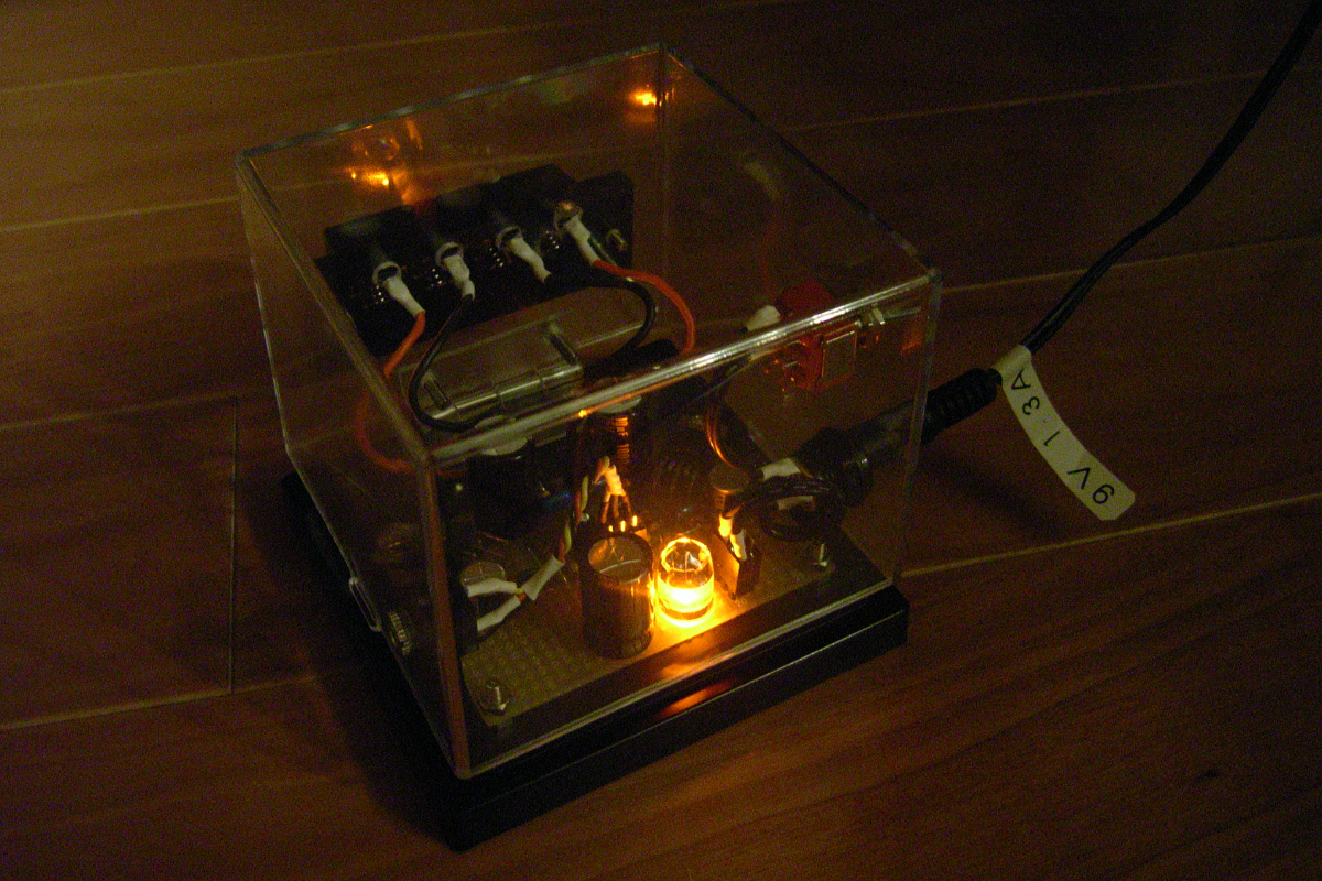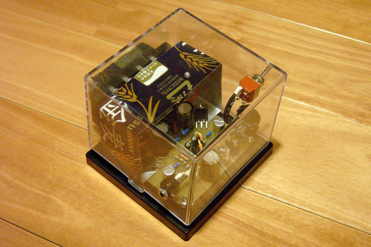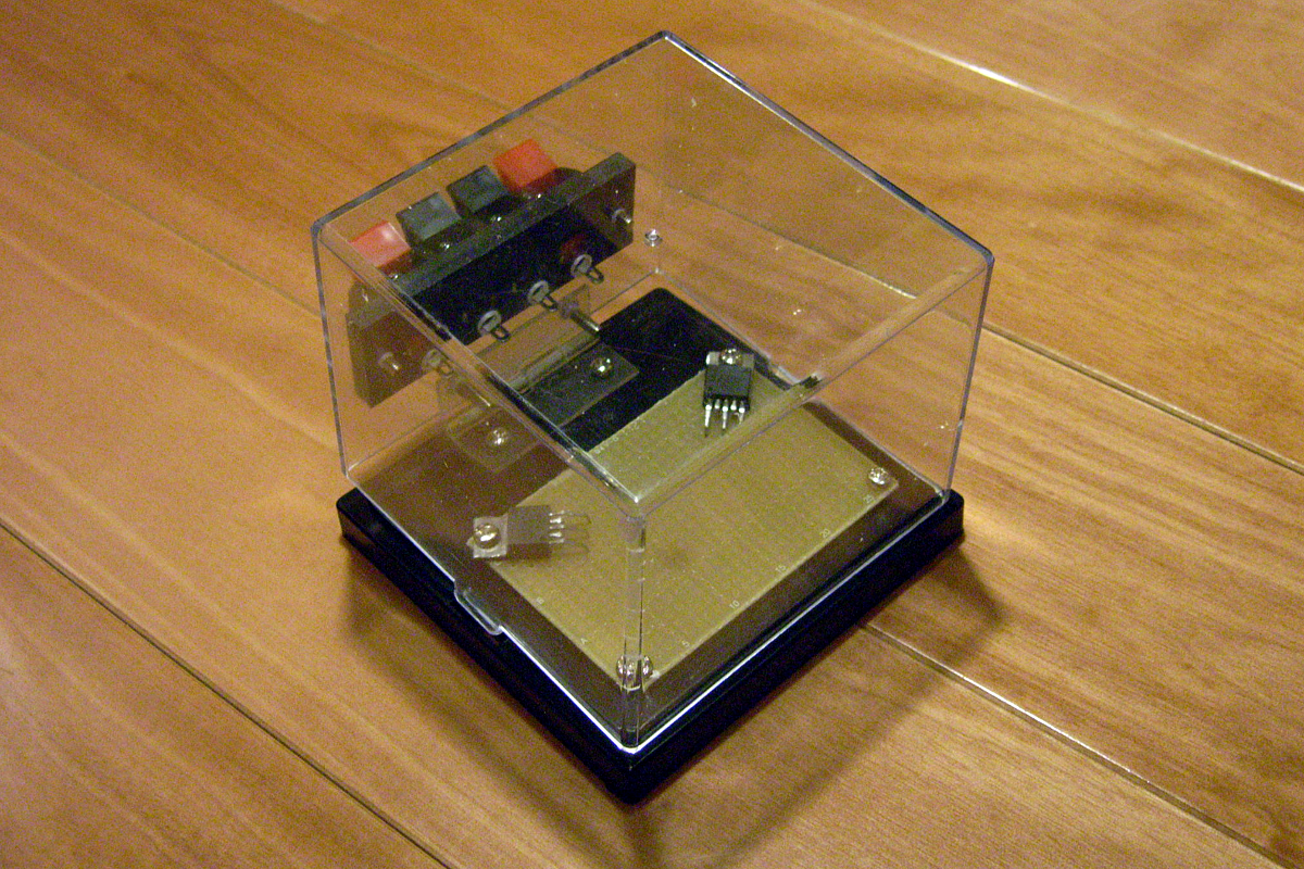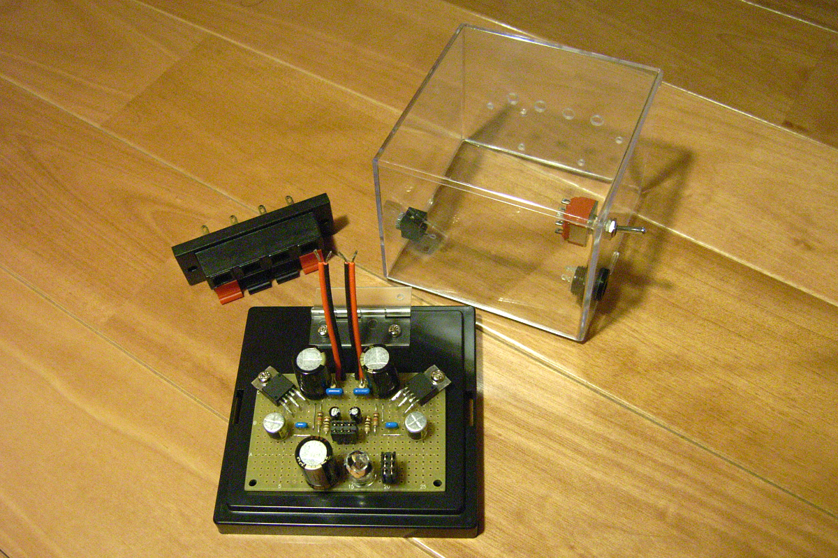 私は「電子部品は美しい」と思っているので、場合によっては、部品の配置等にこだわり「敢えて見せる」のも味があると思う。今回は、シンメトリーな部品配置にこだわり、以前に味をしめたダイソーのコレクションのディスプレイ用クリアケースをエンクロージャに使ってみることにした。なお、透明なプラのチョウツガイもダイソーで購入したものだ。