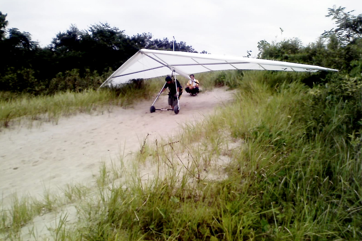 今日はゴルゴタ砂丘での駆け下り教習。ハングを担いでゼーハーいいながら砂丘を上がり、駆け下りて、ふわっと浮いて、数秒で着地する、の繰り返し。まぁ、ももんが程度の飛びなんだけども、それでもこれが結構むずかしいのだ。