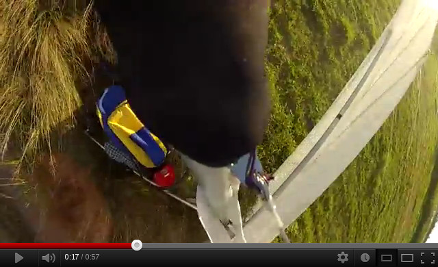 肩を入れ、アタックアングルを調整、腰でグライダを持ち上げて、胸を張る、走り出して、肘でホールド、滑らせるようにやや上に持ち替え、やや引き気味を維持、視線は遠くに、歩幅を広げてさらに加速、少し押し出してテイクオフ、足を揃えて曲げる、やや引き気味に滑空、アップライトは軽く保持しグライダの応答を感じつつ、押し返すようにして直進保持、地面が近づいたらやや押し気味に減速、最後に強く押しだしフレア、足から着地……何度も言われ、頭では覚えているのだが、これを数秒の間で行うには、体が覚えないといけない。オイラの体は頭に比べて相当に頭が悪い(?)。