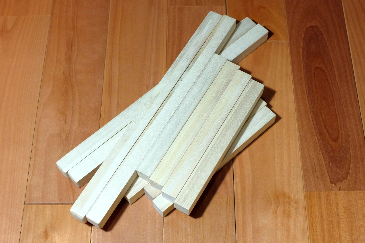 てなわけで、実は昨日ホームセンタに材料を買いに行ったのだが、木材は結構お高い……まぁ、そんなによい材料を使わなくとも、十分なものができるだろう、ということで、ダイソーで売っている910x21x21mmの角棒を使用することに決定した。できるだけ、反っていないものを慎重に選んで6本購入し、ついでに、ダボ用にΦ3mmのたけひご、木材の表面処理のための水性ニス(けやき色)も購入した。