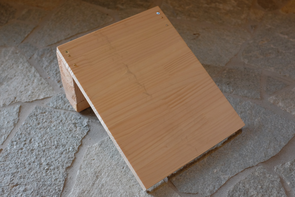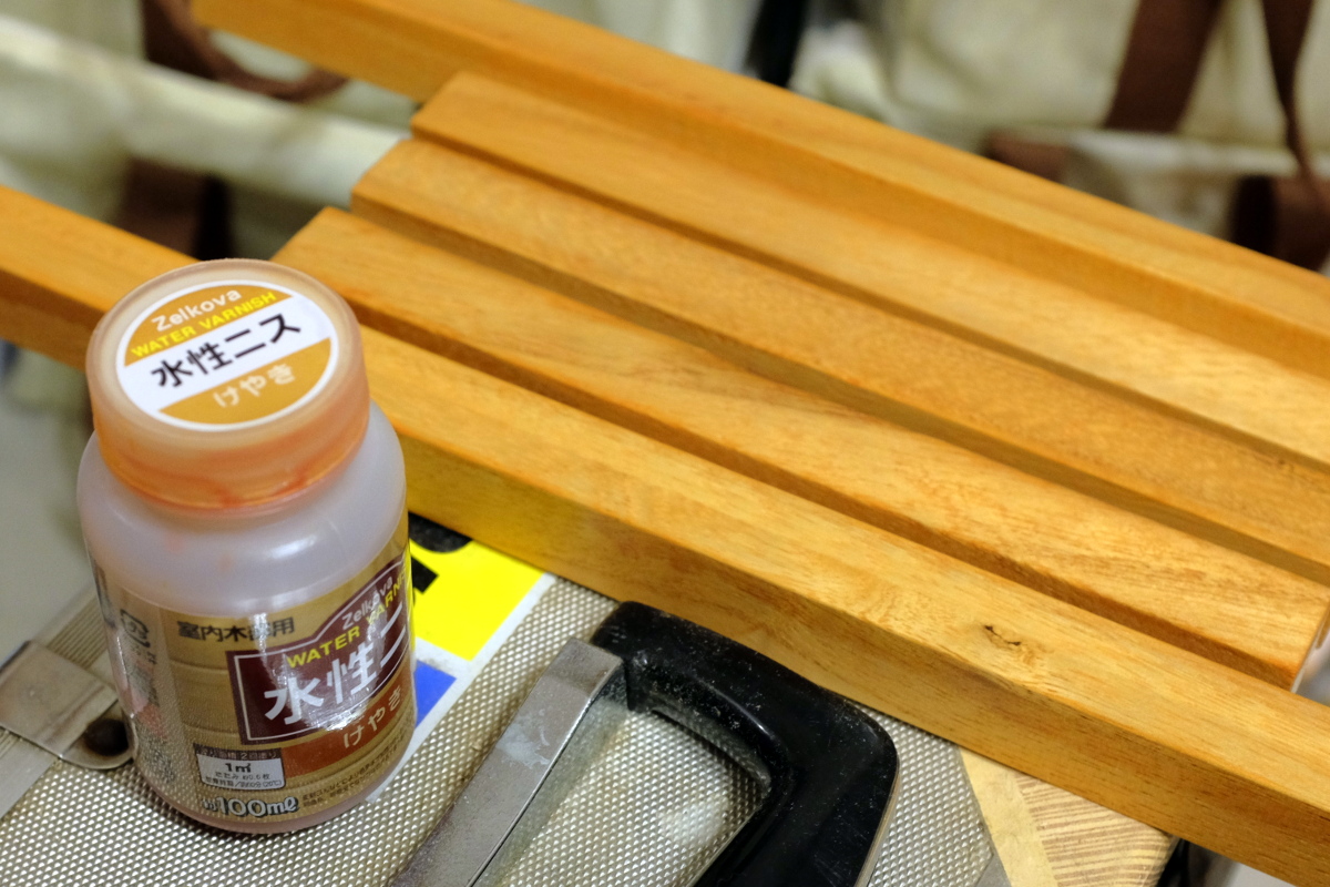 水性ニスは乾いてから重ね塗りする。これがまた、楽しい……白木が徐々に味のある色に変わっていく。木目が強調されて美しさを増していく。木材って、ホント、いいもんだよなぁ。人が木によりそった状態が「休」ってのは心底同感するよ。