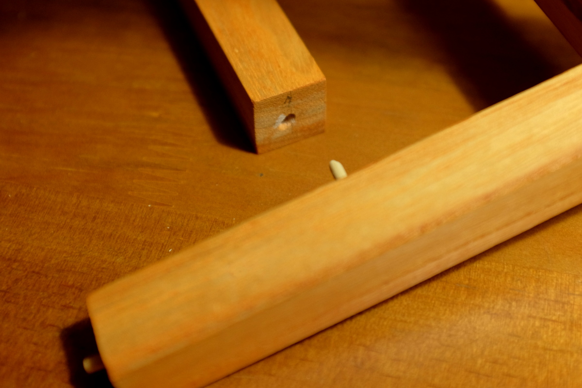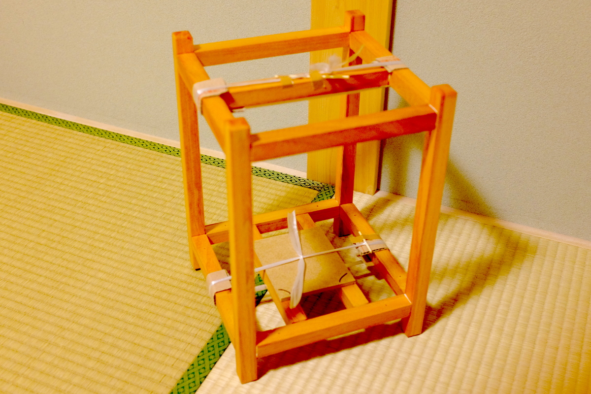 下側の梁に隠し穴を2箇所づつドリルで穿つ。各面には、別途、障子をハメ込む予定なのだが、その固定のため、下側からタッピングネジで突かせるためのもの。隠し穴はΦ2.5mmとΦ6.0mmで2段になっており、ネジ頭が隠れるようにしてある。