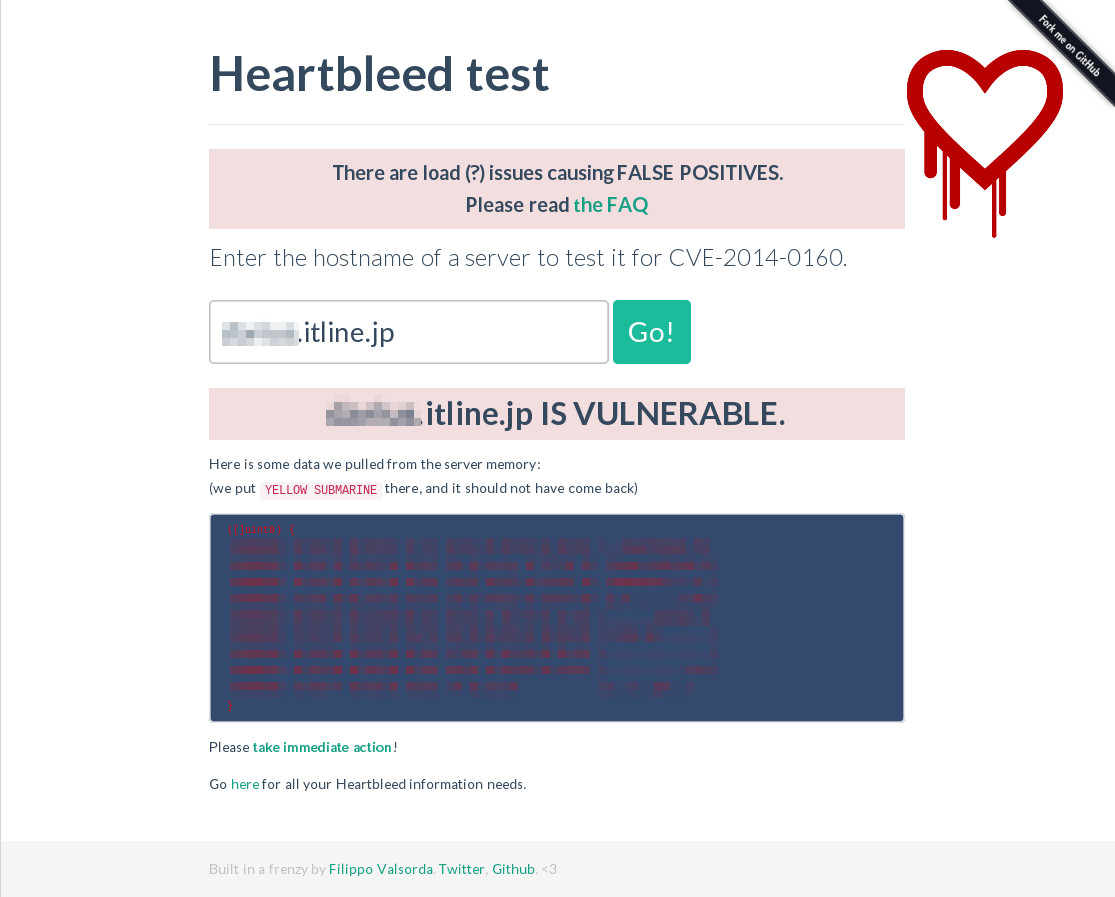 アップデートしてから、apacheを再起動する前に、http://filippo.io/Heartbleed/でチェックしてみた(神経質な人はこのサイトすら疑うべきだが)。