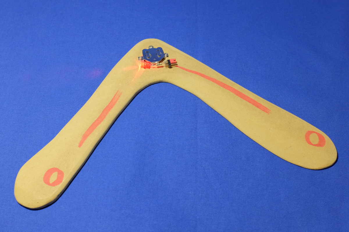 こうなると、点滅バージョンや、多色パターン点灯バージョンなども作ってみたくなるな。加速度計を仕込んで、回転力を反映しても面白い。なんか、リアルにブッカーのブーメランに近づいている気がするな。
