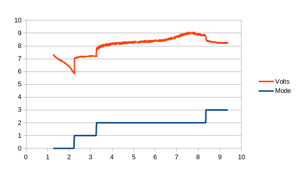 で、今回の工作に戻ると、充電中の電圧をモニタする機能をつけたので電圧の変化をグラフ化してみたところ、規定の充電時間の最後くらいに電圧が下がる現象が見られた。なるほど、これが上述したニッカド特有の現象で、いわゆる-△V検出、とか、デルタピークカットとかいう機能を持つ充電器は、これを見てるわけなのだな。