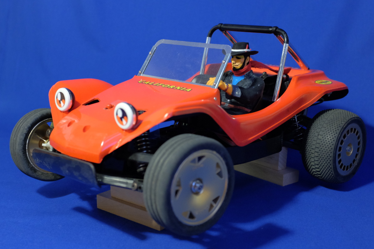 といっても、ボディは以前に完成しており、既にラジコンのサーキットまで走らせに行って、ぶつけてキズだらけにしているし、最初に買ったラジコンに付いてた540モータに換装してあるし、ちょっと気張って、前/後ともオイル入りのダンパーへの交換も済ませてあるし、タ/イ/ヤ/等も交換してある。今日やったことは、オッサンの人形を仕上げて乗せただけだなのだが。