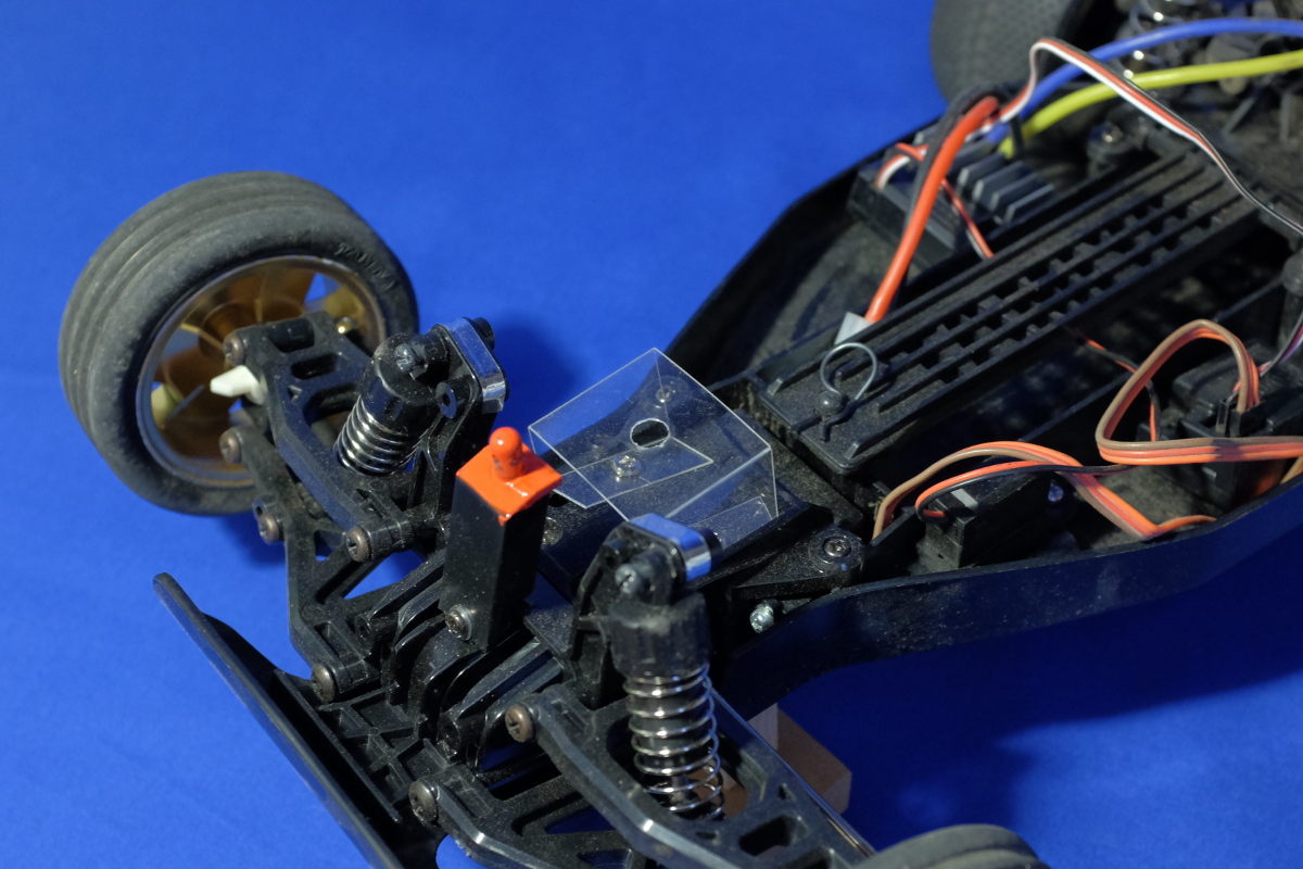 最後まで悩んだのは、レースの時、タイム計測に使うトランスポンダ(AMB)モジュールの取り付けステーをどうするかということ。DT-02シャーシには標準では用意されていない。取り付けに良さそうな場所もない。適当に乗せて落としたらマズいし、テープで貼るのもよろしくないし、気分的なものとはいえ高い位置に載せたくもない……。