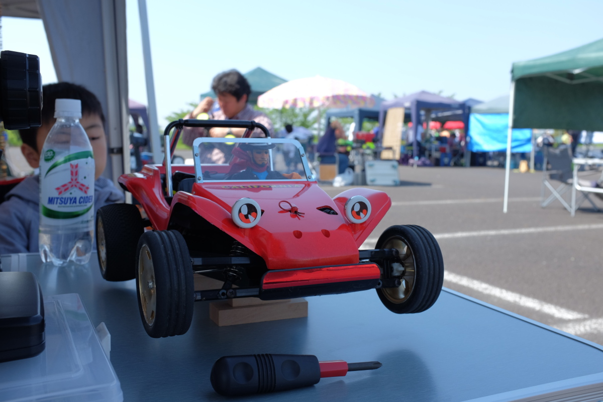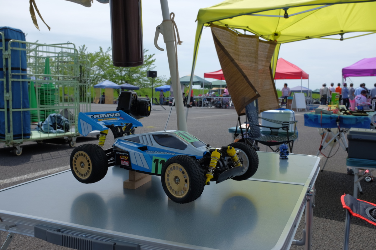 8時ごろに会場に着くと、今日はやや曇天でちょうどいい気候。練習走行まで間があるので、車検に向けガキにモータを外すよう指示しつつ、昨日ホームセンタで買ってきたばかり漬物石を使ってテーブルとパラソルでチープなピットを設営する。