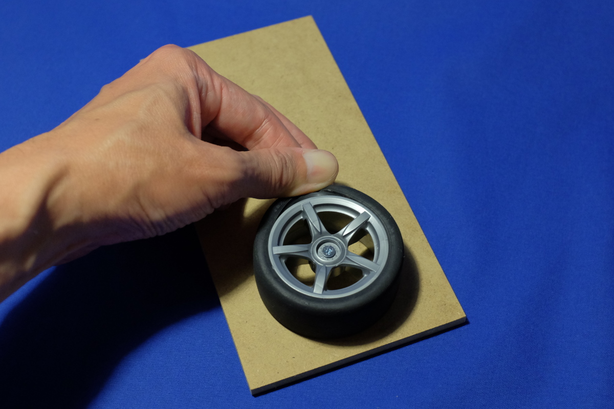 今日は、ホームセンタでΦ4mmx40mmの皿ネジと端材を買ってきて、先日の自作のタイヤ接着アダプタを作りなおしてみた。今回は、端材の裏に皿ネジのザグリ加工を施し、ネジの頭が板の裏側に来るようにして、タイヤの上面をナットで止める形に変更する。こうでないと、ホイールのオフセットに応じてボルトの長さを変えなきゃならんので。