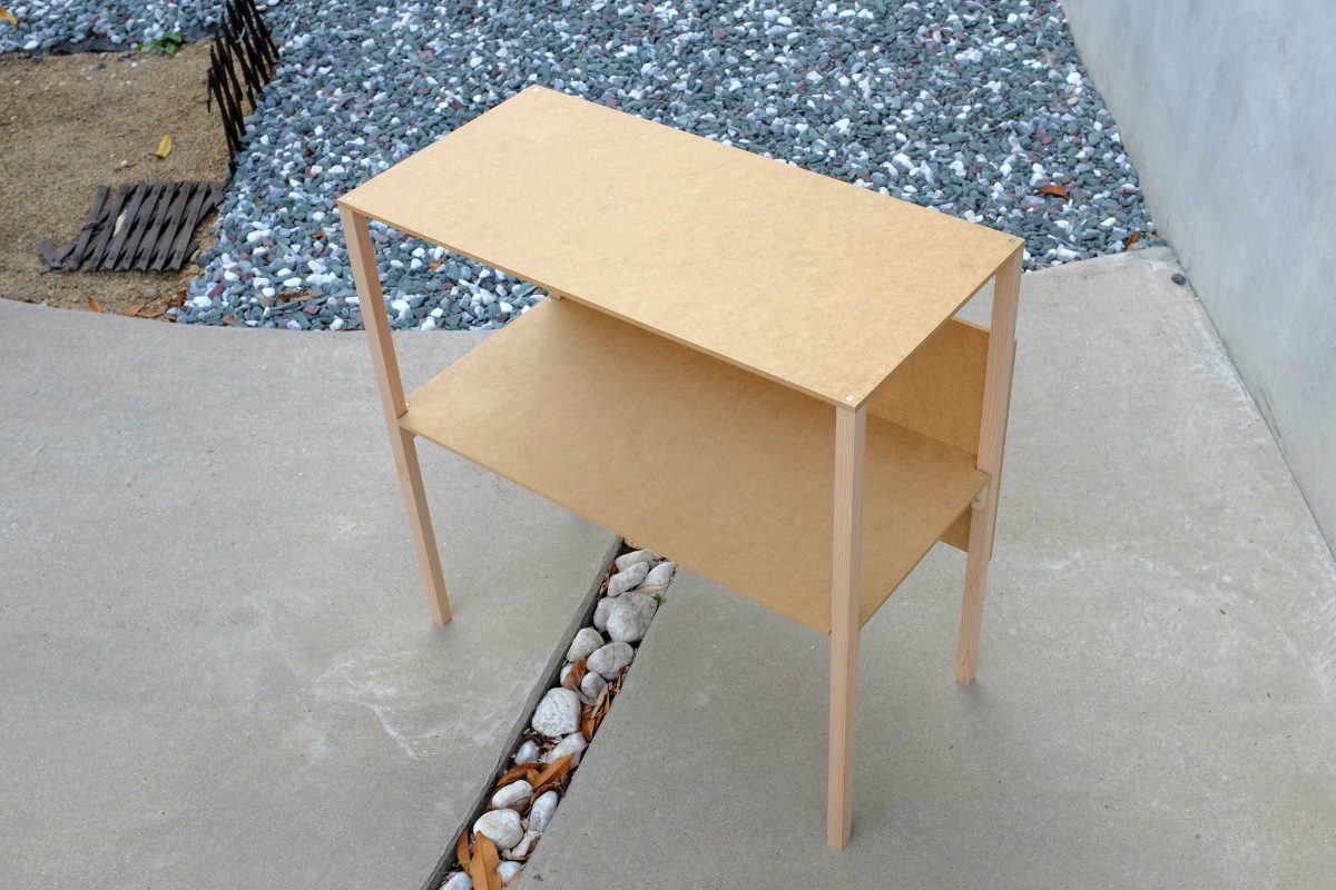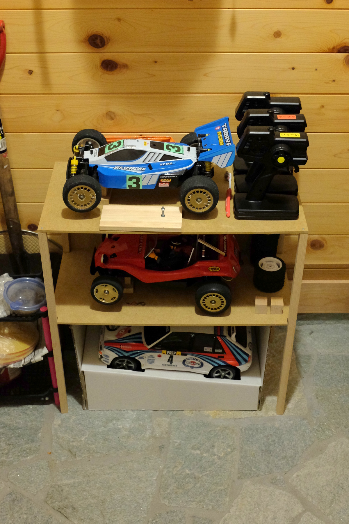 あわてて、筋交いを取り付けたが、タコ糸の筋交いじゃ、まったく効果がない。ラジコンを載せるだけだし、いいかな、とも思ったが、余計に買っておいた天板と同サイズの材料が残っていることに気づいた。背面に打ち付けてみる。これは効果大。左右方向の歪みはピタリと収まった。前後方向は……まぁいいや。完成。