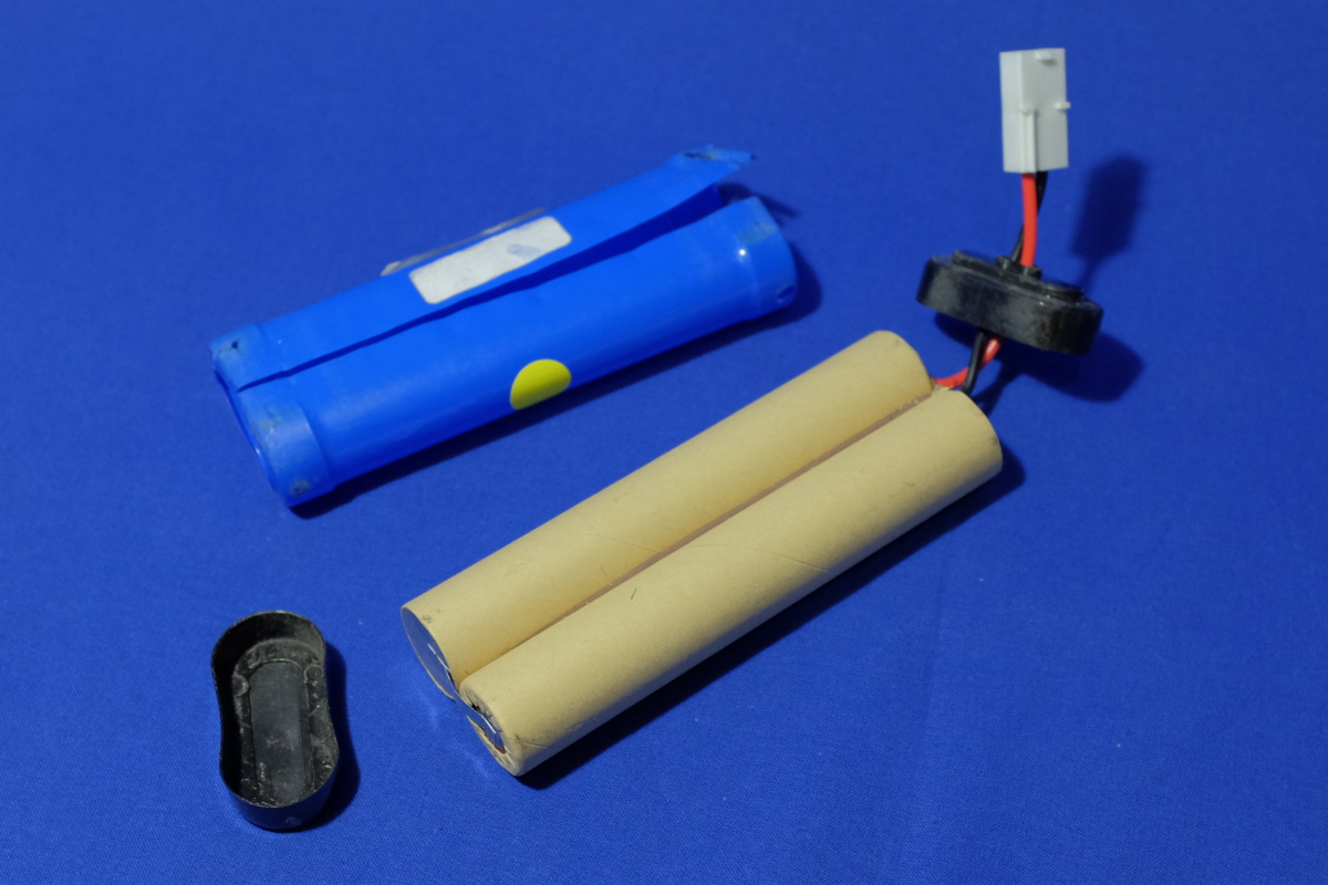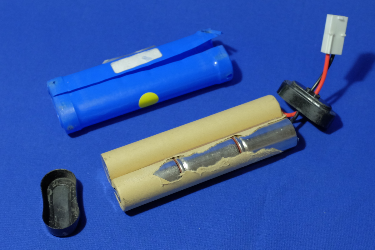 サランラップかトイレットペーパの芯のような紙を想像したが、固く巻いてあるだけで、紙自体そんなに硬くはない。指でビリビリと破く。金属むき出しのセルが現れるが、指にビリビリくることはない。これ、外装を剥がさなくても、外から細い針を刺せば、各セルの電圧を計測できたかもなぁ。