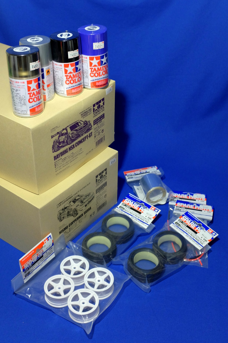 さて、先日の成績のご褒美ということで、RAYBRIG NSX CONCEPT-GTのボディほか、各種のパーツを購入。ちょっと前までENEOS SUSTINA RC Fで走りたいと言っていたのだが、いつの間にか変わっていた。もう一台のボディは……なんとなくオイラ用。もちろん、素直に組む気はない。イヒヒ。