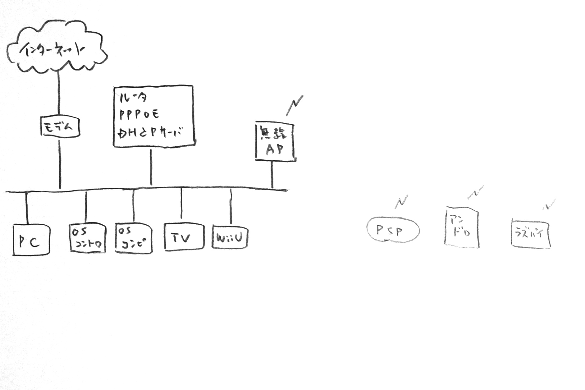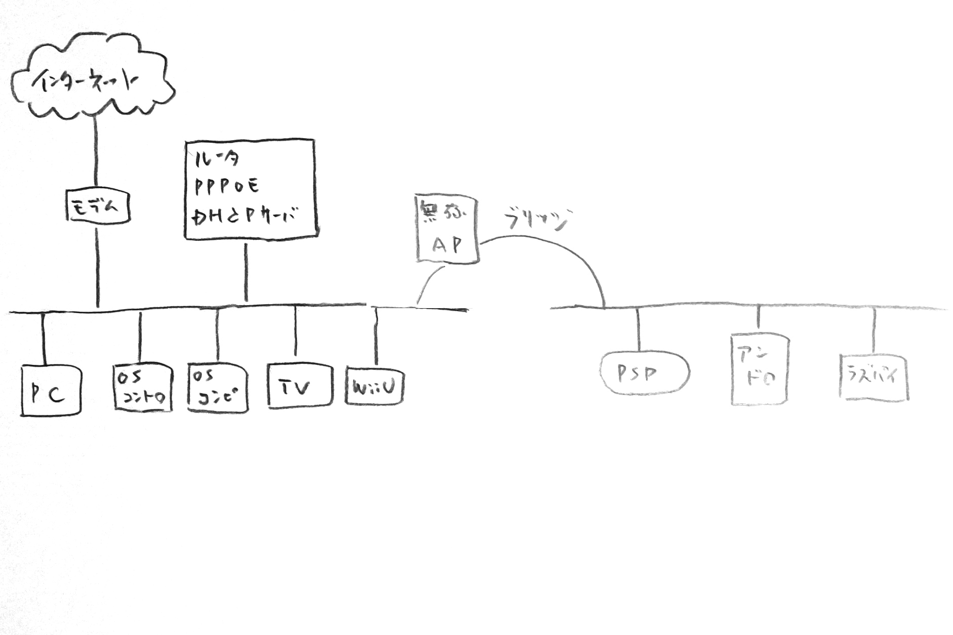 無線のアクセスポイントはplanexのMZK-MF300N2というものを使っており、ルータモードでなく、アクセスポイントモードで動作させている。つまりは、有線ネットワークと無線ネットワークをまたがるブリッジとして動作しているわけだ。無線を有線に置き換え、ネットワークの状況を図化すると、以下のようになる。