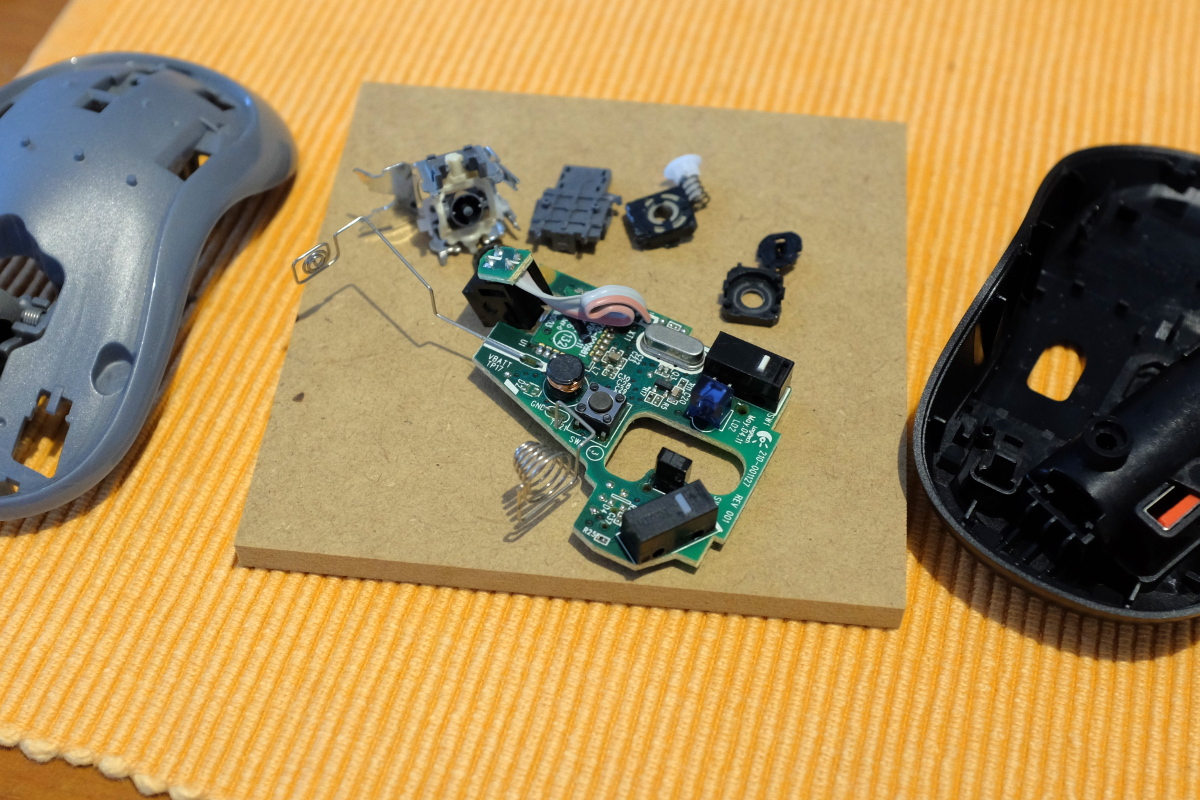 と、今日の工作はまだ続く。最近、またもやマウスのセンタクリックが「渾身の力」を込めないと反応しなくなってしまったので、昨日、ストックしてあった色違いのグレーのものと、下部を丸ごと入れ替える対応を行っていた。というのも、手持ちのタクトスイッチにサイズの合うものがなかったから、修理ができなかったのだ。