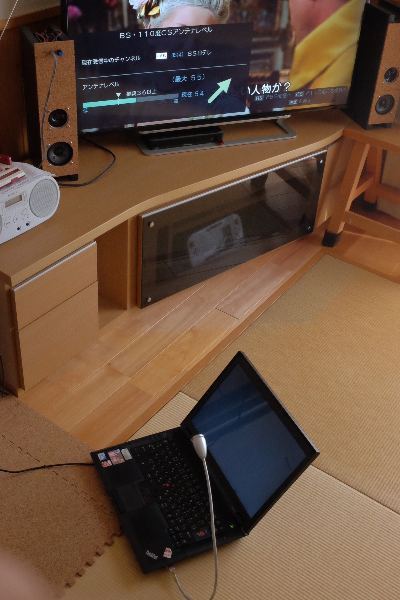 で、例によって、パラボラアンテナの向きの調整には、ウェブカメラとVNCを活用するのがベストなのである。今回、VNCサーバはカミさんが使わなくなったThinkPadT400。また「Che-ez! webbie」という骨董のウェブカメラを引っ張り出してきて(数年ぶりなので探しだすのに苦労した)USBコネクタに挿す。アプリはvlcでアッサリ映った。VNCクライアントはオイラが使わなくなったPORTABOOKである。PORTABOOKはWindows10に戻してしまったので、厳密にはVNCでなく、リモートデスクトップ接続。T400にはxrdpをインストールした。