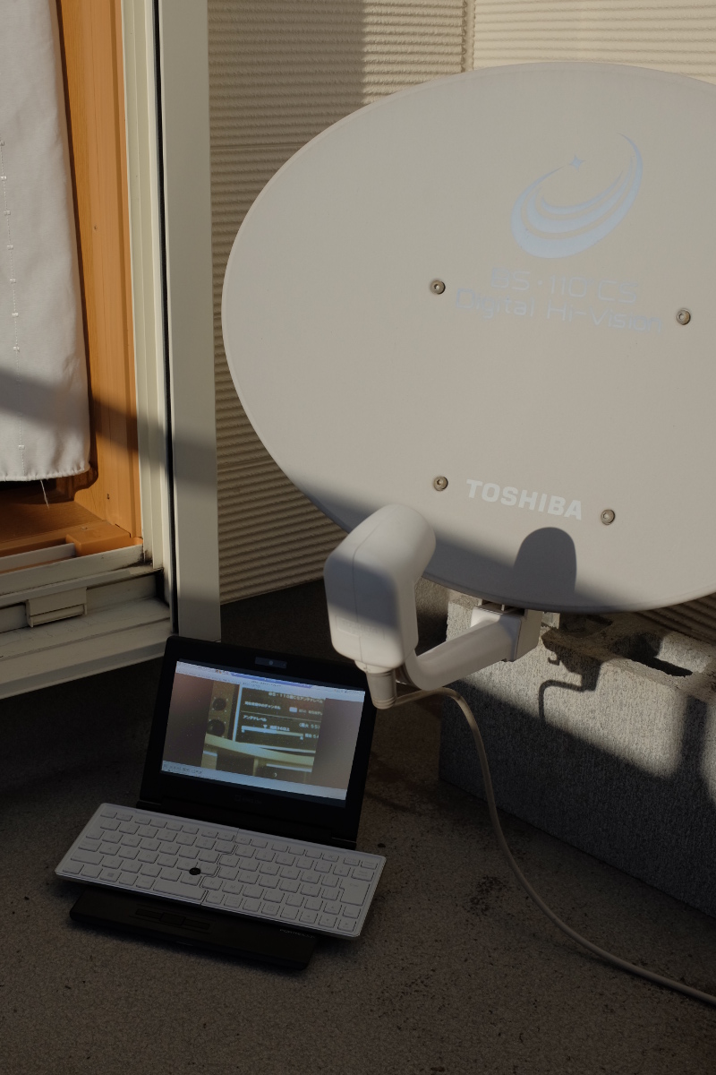 手元の画面を見ながら(画面はハメコミ合成です)、アンテナの向きをチョイチョイと調整し、アンテナレベル55(推奨36以上)を達成。今後はズレて録画に失敗したりすることはないだろう。なにせ、これまでブロックに挿した木の棒にアンテナをくっつけていたのだからな。これにて、衛星放送受信環境改善作戦を終了する。