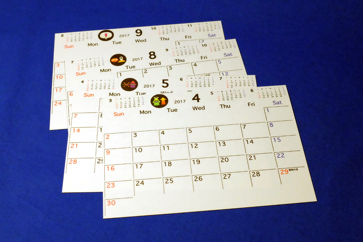 さて、引き続き、先ほどレンダリングした卓上カレンダを印刷する。以前より少しスクリプトを改善し、前後の月や、ワンポイントのイラストが入るようになっている。生成されたPDF(4月〜、8月〜)とライブラリごとスクリプトを置いておく。