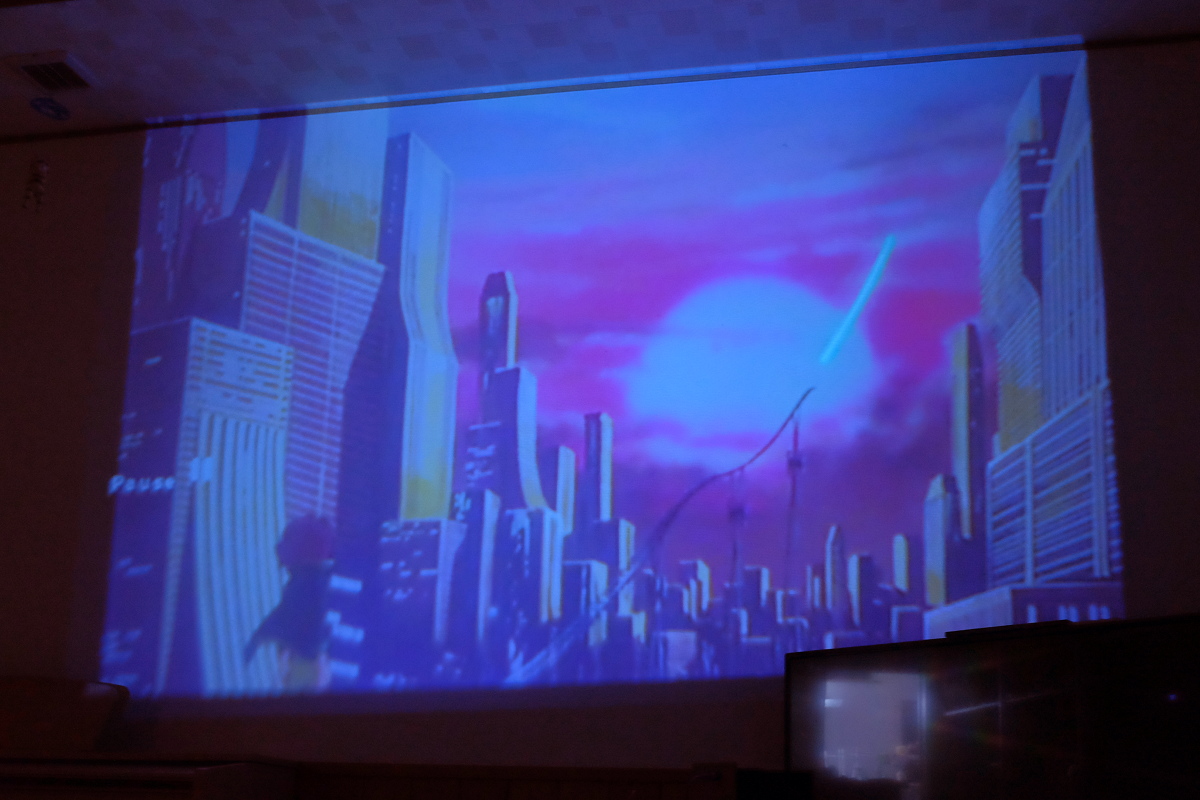 まず「映写/設置位置」は、階段の手すりの外側で、運よく映写対象となる白壁の高さとジャストフィットであった。イスよりも高さが上がった分、台形補正の強度も下がり、左下の片ボケの程度も低下した。よっしゃよっしゃ。