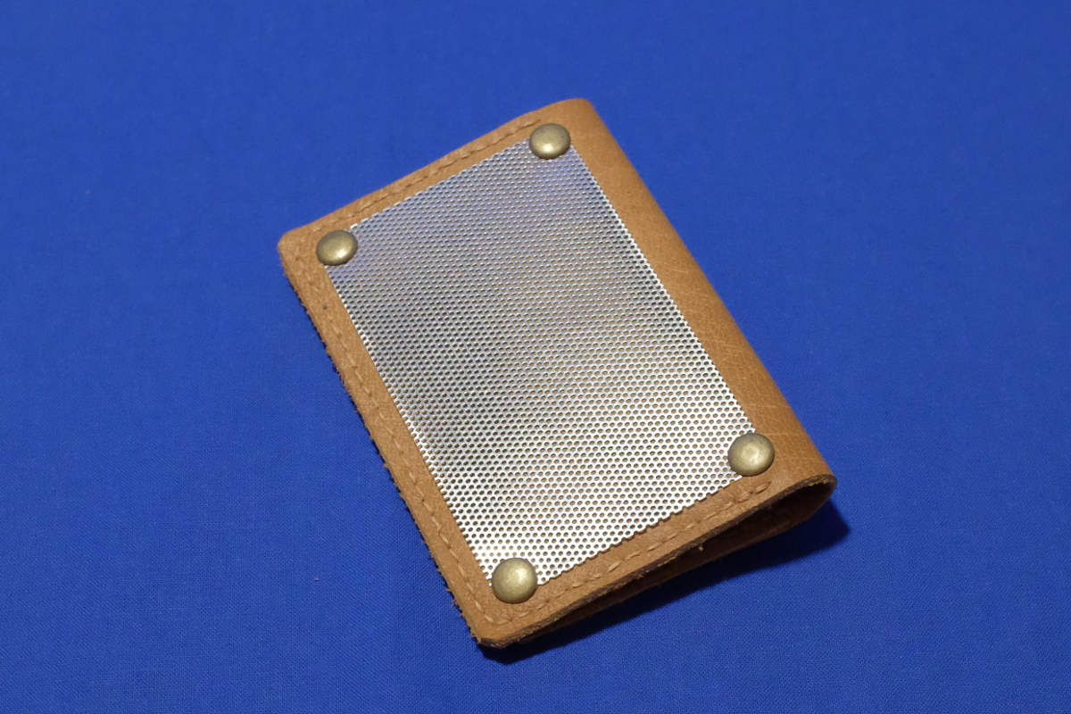 先に、革とパンチングを適切な大きさにカットして、双方に下穴を開け、カシメでくっつける。あとは、縫い合わせるだけだ。本格的なレザークラフトのための道具はなく、以前にズタ袋を作った時に買った針と糸とロウくらいなのだが、安いドライバセットのキリで4mm間隔で下穴を空けて縫っていき、完成。