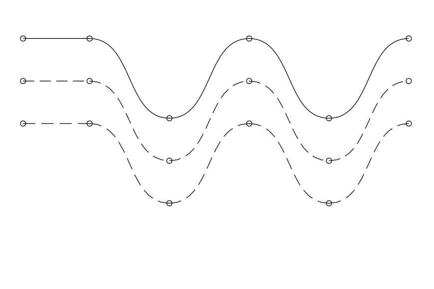 ちょっと調べた限り、タートルグラフィックスにベジェ曲線を実装した事例は多くないようだが、その中でも、我ながらもっともシンプルかつ美しい実装方法であると自負している。オプションを与えることで、制御点までの距離や、破線のパターン等も指定できる。