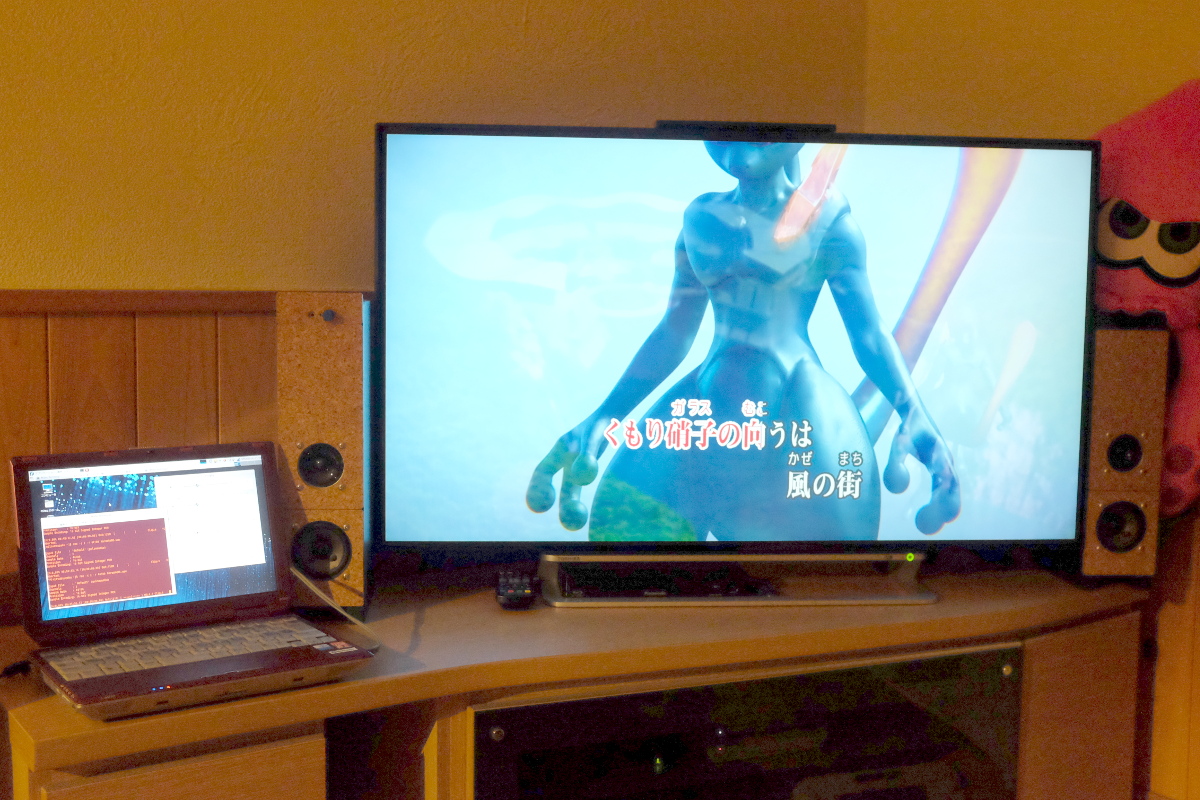 しかし、通信カラオケだけあって、曲のカバー率はスゴいな。筋肉少女帯だけでも百曲以上ある……というわけで、日を改め、イザ録音するのであった。チケットは3時間をチョイスして324円。基本的な手口はコレ。今回は、テレビのライン出力をLinuxノートのマイク入力に挿し、GUI上で「サウンドの設定」の「入力」の「入力レベル」を調整してから「$ rec -c 2 -r 44100 karaoke01.wav」という感じで録音。録音したらcccdctでチョキチョキ切ってlameでmp3化。