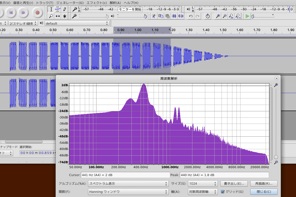 ちなみに、実際に出ている音が正しいことの確認のため、PCからのライン出力をライン入力につっこみ、自身で再生した音を自身で録音、wavファイルとして保存、audacityでスペクトル解析してみたところ、ちゃんと、440Hzにピークが来ていた。よっしゃよっしゃ。