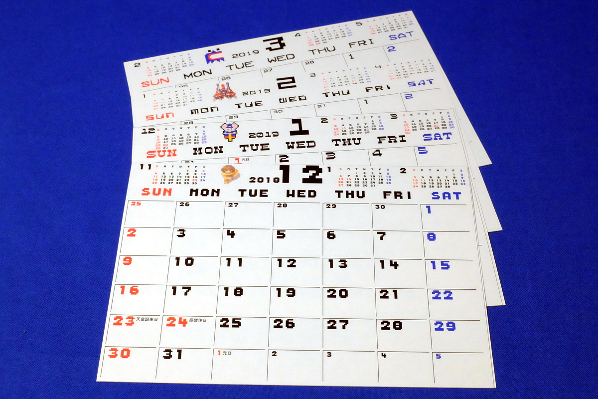 そろそろ、ということで、4ヶ月ぶりに、またもや自作の卓上カレンダを印刷する。思い返せば、自作のカレンダを使うようになって、もう丸2年が経つのか。今期は「エイリアンシンドローム」「ホッピングマッピー」「レイフォース」「Mr.Do」モチーフである。