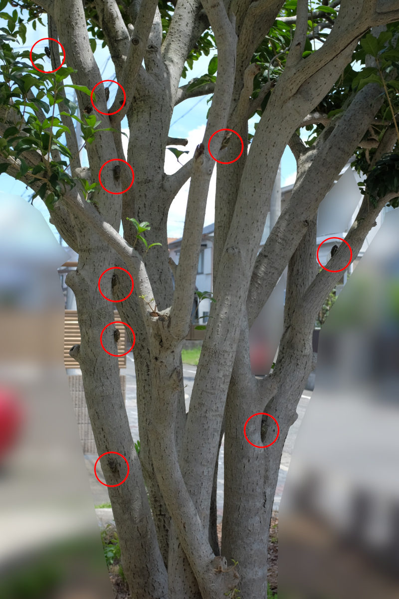 最近、セミの鳴き声がうるさいと思ったら、こんな数の大合唱だったのかよ……セミ・オーケストラか。なぜか、この時は一匹も鳴いてなかったけど。昼は揃って自動的に停止するのか? セミ・オートマチック? しかし、しっかりと間隔を空けて止まってますな。すばらしい。