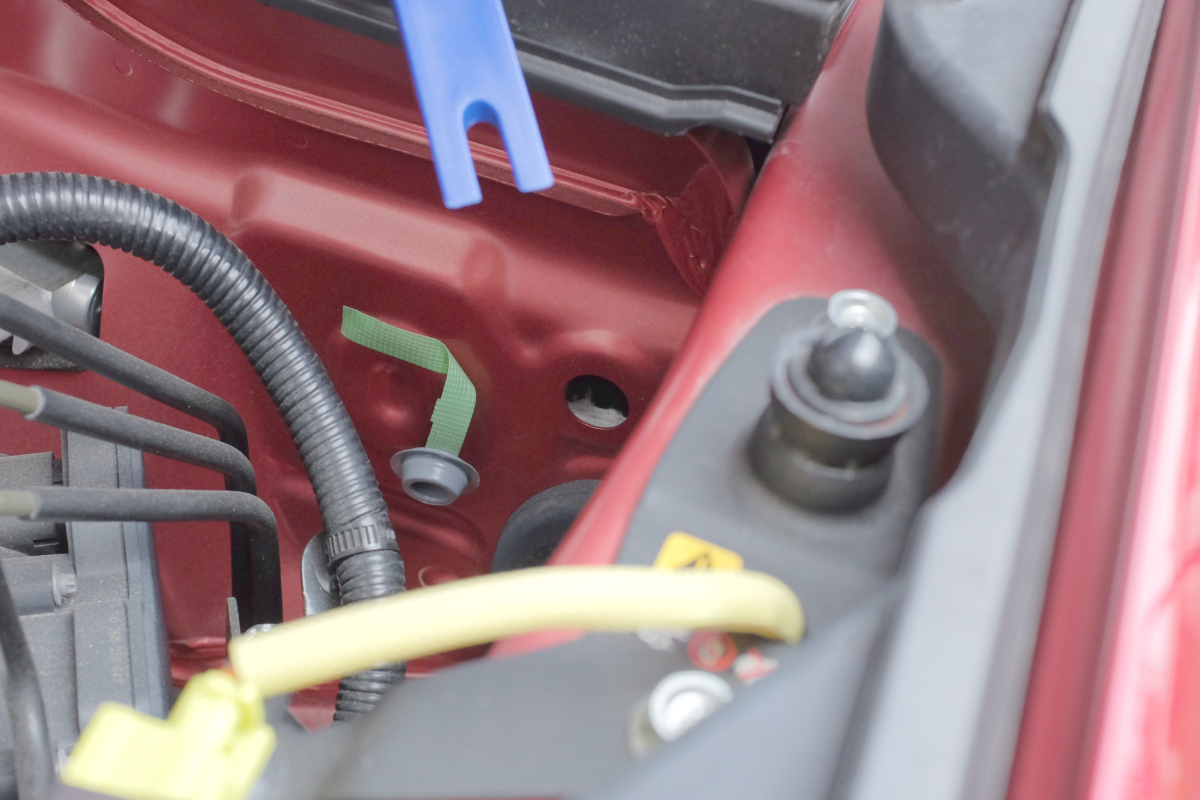 しかし、位置的にもそこから配線を引き込むのは非常に理にかなっている。ので、思い切って内装剥がしツールを使って、グロメットを引っこ抜いてみた。勢い余ってどっかに飛んでいかないよう、養生テープを貼り付けつつ。