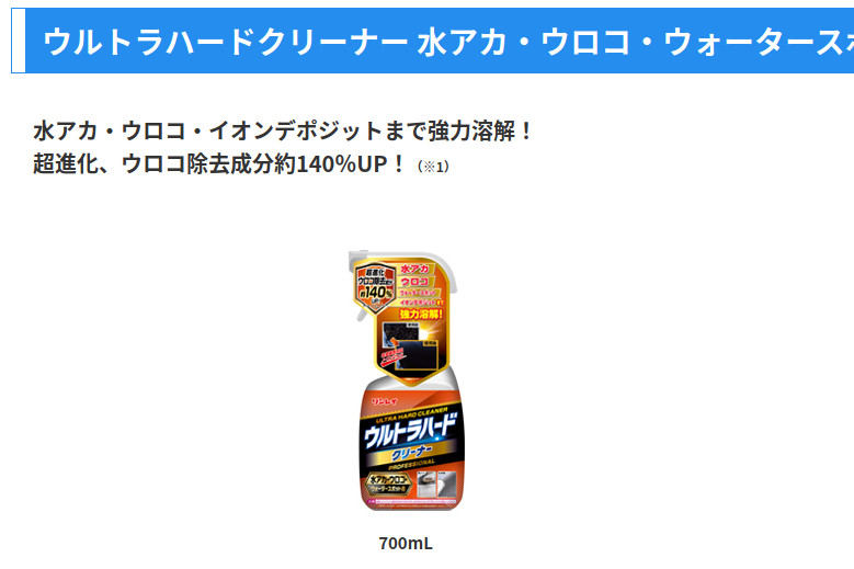 いろいろ調べると、ウロコとか、イオンデポジットとか、ウォータスポットとかいうらしいが、普通に洗車しても取れないらしい。細かいコンパウンドでクリアを削るしかないのだろうか……と、思っていたら、なんでもそれを取り除けるケミカルクリーナがあるらしい。その名も「リンレイ ウルトラハードクリーナ 水アカ・ウロコ・ウォータースポット用」。
