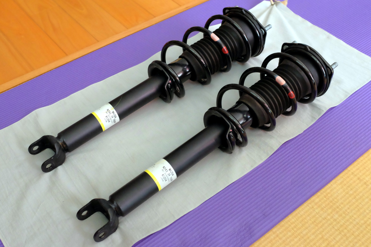 というのも、最初に買った一式は「アッパーマウント付き、走行10000km、ダンパー前N243-34-700B、後N243-28-70XB、スプリング前ピンクと赤、後ピンクと黄」というもの。だいぶ値が張ったものの、実際にかなりの美品なのでそれはいいとして、AT車から外したものということで、どうやらスプリングがSグレードのものとは違うようなのである。