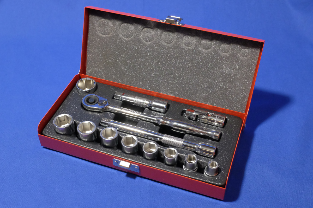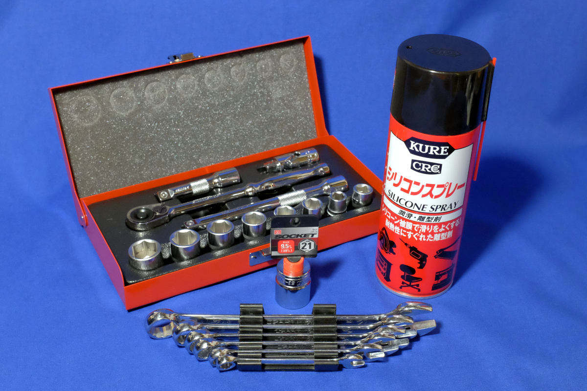 とはいえ、武器は必要だ。少なくとも、スプリングコンプレッサが必要なので購入しなくてはならない。レンチは30年近く前に購入したコンビネーションレンチセット(8, 10, 12, 13, 14, 17mm)がある。鏡面仕上げの美品で、調べるとダイヤ精工のTOUGHシリーズらしい。ラチェットレンチはあるにはあるが、安物なのでこれは新調したい。高級品を買いたいが、そんなに高頻度では使わないので、ソコソコの物を。悩みに悩んでSK11のソケットレンチセットをチョイス。