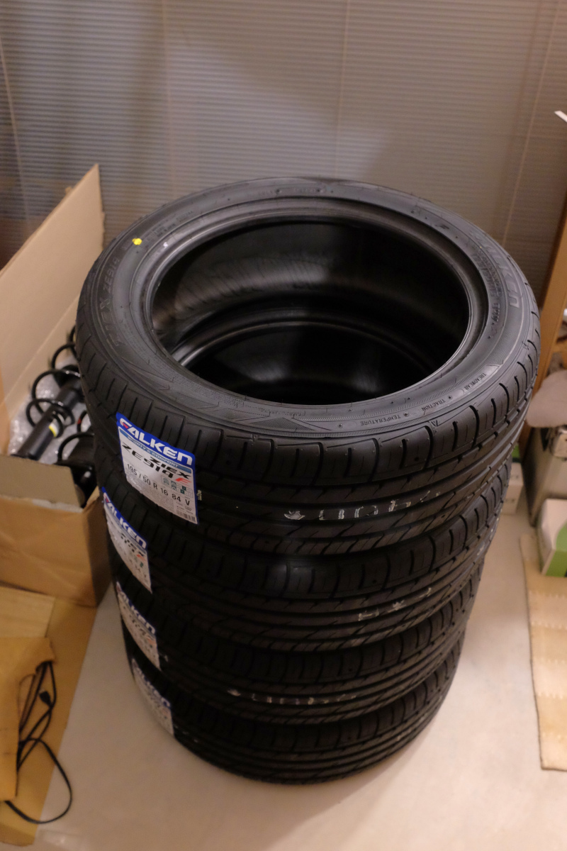 と、いうわけで、タイヤが届いた。特段のコダわりはない、というか、むしろ純正状態へのコダわりがあるので、純正ホイールに見合った正しい195/50R16サイズのタイヤを選択。でも、タイヤの銘柄は変更。そんなにブイブイしないので、過度にエコでないもので、コンフォート系でお安めでお勧めされた、ファルケンのジークス(ZIEX)のZE914F。1本9,000円弱というモノをチョイス。