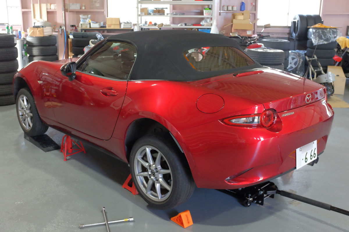 おおげさなようだが、NDは前側のジャッキアップポイントがだいぶ奥側、かつ、極小で、かなり当てるのが難しいのだ。しかも、そのすぐ奥には、オイルパンの下を覆うアンダカバーのボルトがあり、それに触れてはならない。つまり、フロアジャッキの皿の奥半分だけを、フロントクロスメンバに当てる必要があるのだ。±5mmくらいの精度が要求されるんじゃないかな。実際、皿が滑って、その手前をジャッキの皿でブチ抜いて、パワステモジュールを破損、修理費20万越えという話を聞いたこともある。おいたわしや。