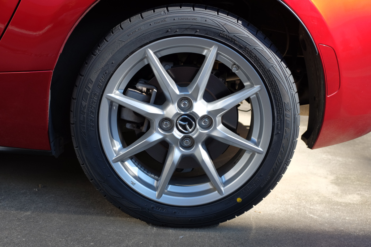 しかし、このホイールは純正だがデザインが好みだ。4穴だからスポークも8本。開口部が広く、シンプルでイヤミがない。クリア塗装のみ(たぶん)のシルバーが美しい。こう見ると、レイトレーシングCGか、液体金属型ターミネータに見えてくるほどだわ。最近のNDロードスターの標準ホイールは、どれも暗めの塗装が施されていて、シルバーのホイールは自分の世代(ND2)のNR-Aまでだったはず。この色が最高にイイのに。