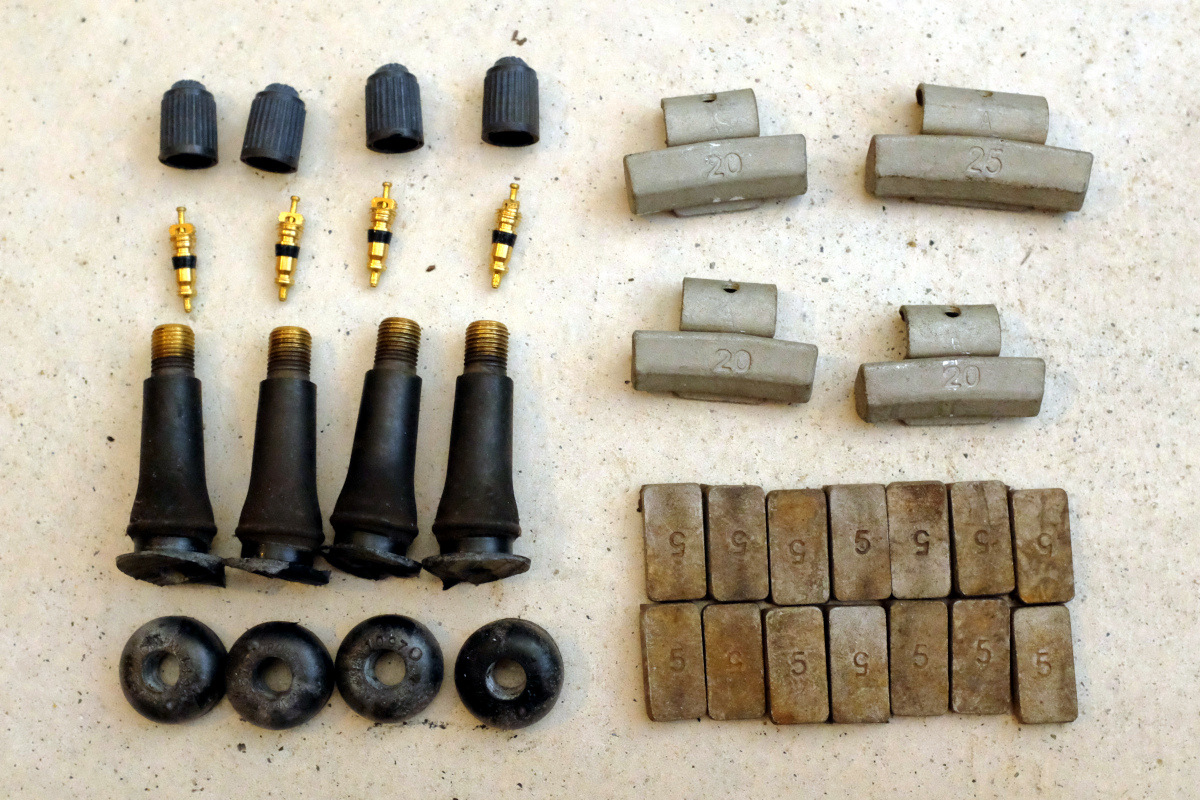 ふと、昨日、作業後に持ち帰ってきたゴミ袋を開く。ムシは予備として保管しておくかな。ウェイトの取り付け場所までは記録していなかったが、内側には4本とも割と大物の打ち込み式が付いていた。貼り付け式も4本の合計は70g。なるほど。