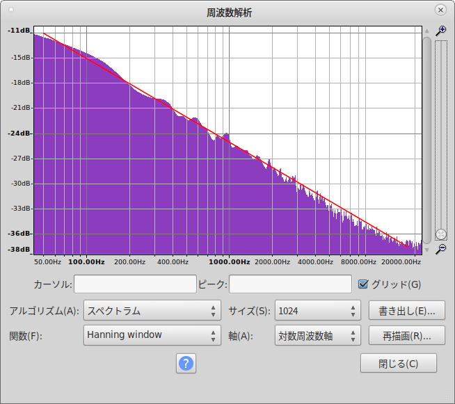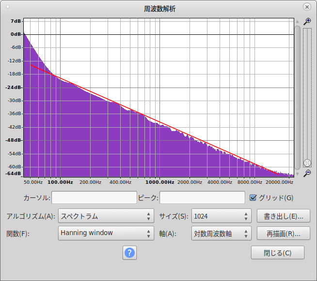 ピンクノイズの特徴は「1オクターヴあたりパワーが3dB降下」である。言い換えると「周波数が倍になる都度パワーが3dB降下」。同じく、理想的な降下ラインを赤で示してみたが、ほぼピッタリであり、実現できたといえよう。