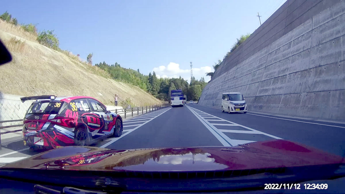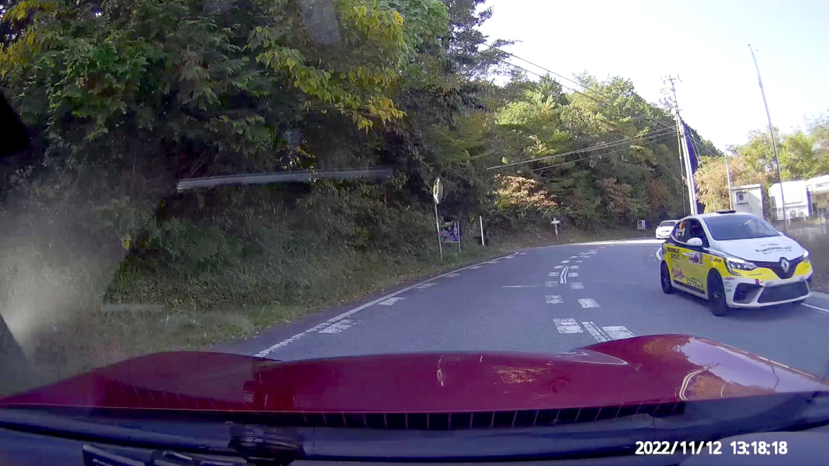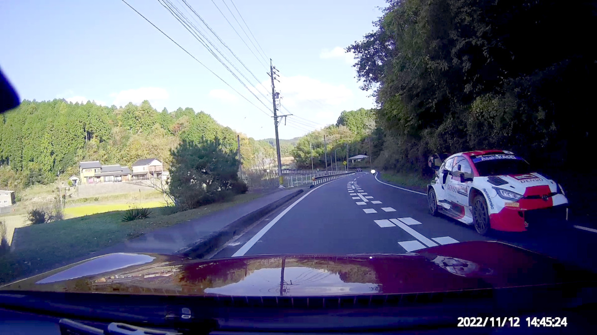 そのまま301号を進み、473号に入り、SS8/11 Nukata Forestのスタート地点付近から、リエゾン区間の逆走を始め、向かってくるラリーカーを迎撃する。おー、大漁大漁。次々にすれ違う。記念撮影はドラレコにお任せである。なんちゃってラリーカーも走っているようだが、プライベータも含まれているので、ナンバーが付いていることで、それを識別することはできない。まさかと思ったコペンは競技車であった。中にはカニでキジでマツダのディスリで有名な国沢氏のクルマも含まれていた。