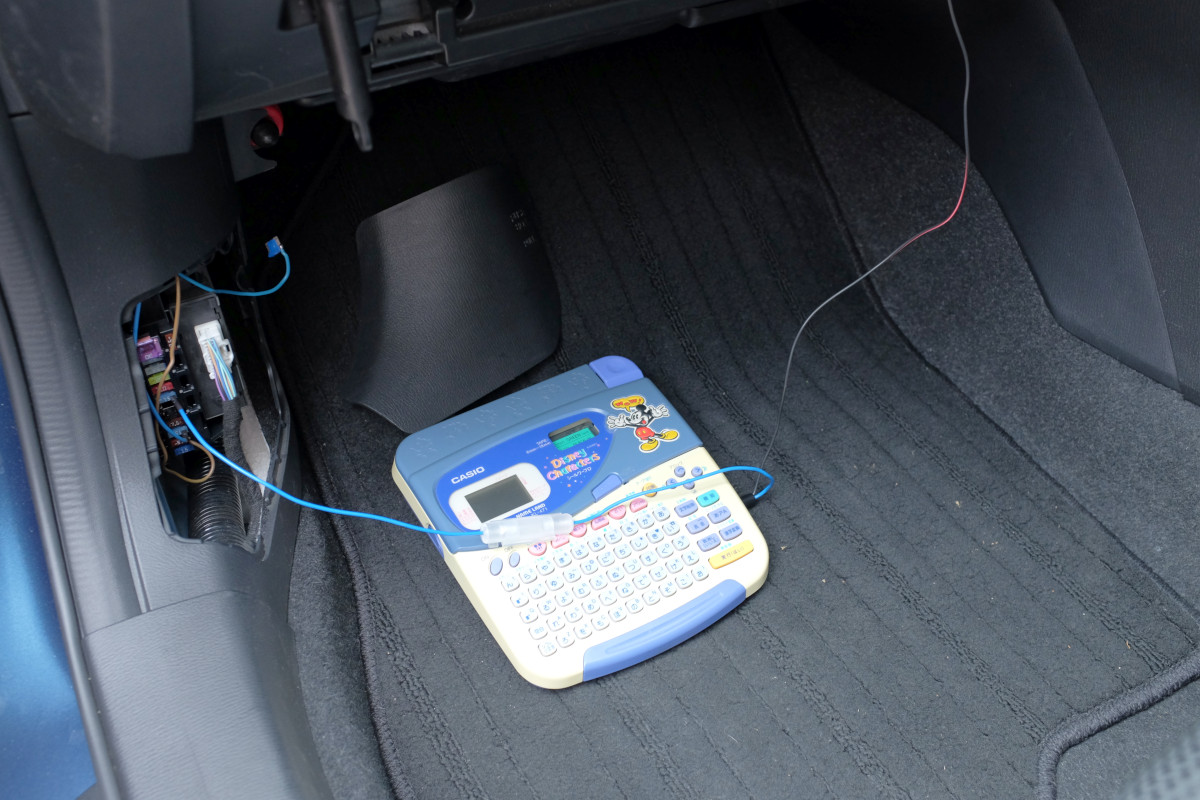 これ系の製品は多くの種類が市販されているが、バッテリターミナル、OBDコネクタ、アクセサリソケットなどに接続するようになっている。しかし、バッテリターミナルだと作業の邪魔だし、OBDコネクタだと対応コネクタがいるし、アクセサリソケットだとナビが動くから電源容量が不足するはずだ。ヒューズ電源から供給するのが一番だと思うがそういう製品は見当たらない。というわけで自作したのであった。ラベルプリンタを使ったのは、単に12Vの電池ボックスとして格好だったから、である。