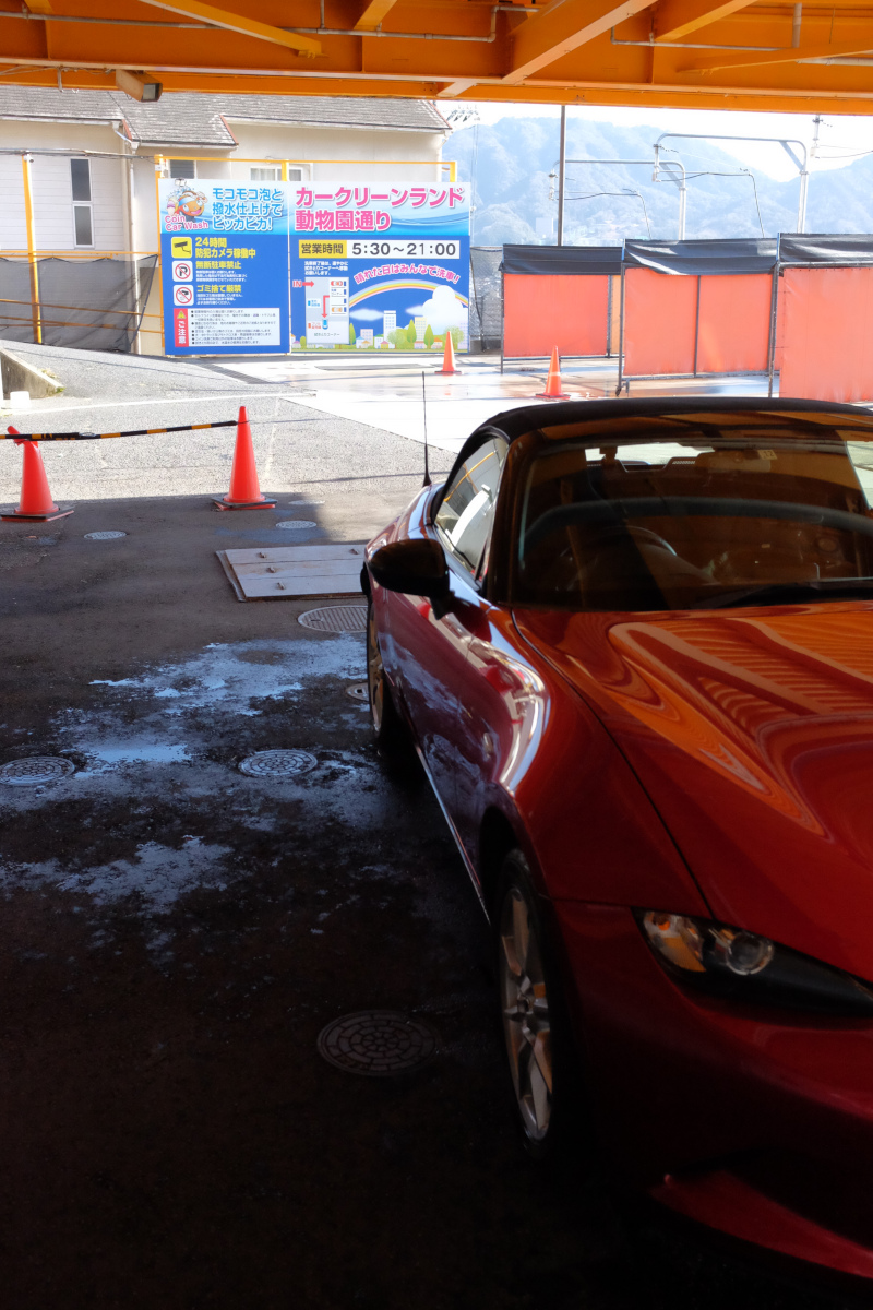 蔵之元港の地形的に、下船した車は、ほぼ南に向かうことになるので、フェリーから出たまんまの隊列でしばらく走ることになった。で、淡々と走っていると、あ、ここだ、となって停車。実は、事前に洗車スポットをチェックしていたのだよね。広島での洗車から6日経って、だいぶホコリまみれになっている。コイン洗車場も2回目だが、なんだか前回とだいぶ様子が違う。多くの車が自動洗車機に並んでいるのに、ジェット洗車コーナには誰もいないし、ジェット洗車コースがたったの100円だし、水の出もだいぶおとなしい。