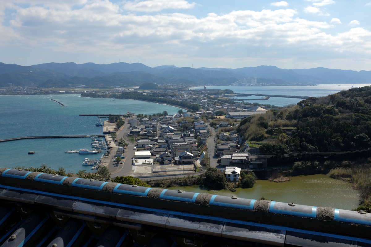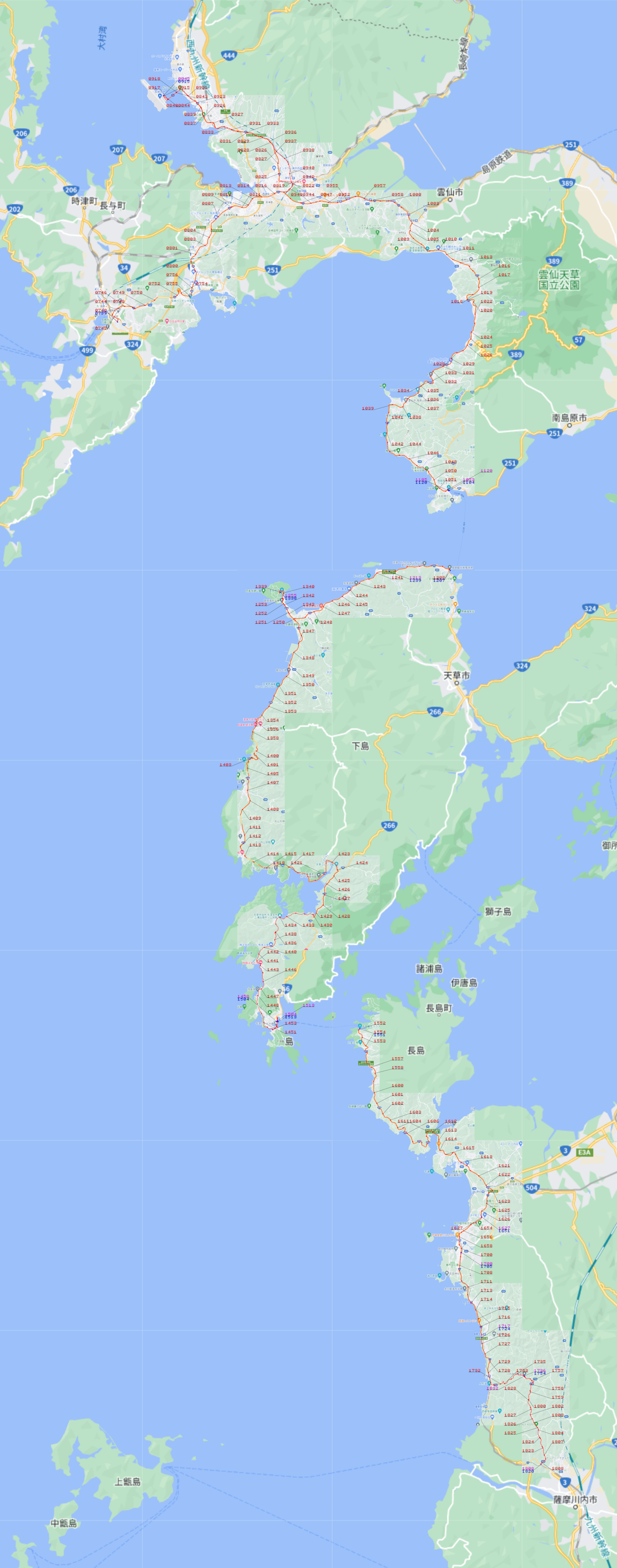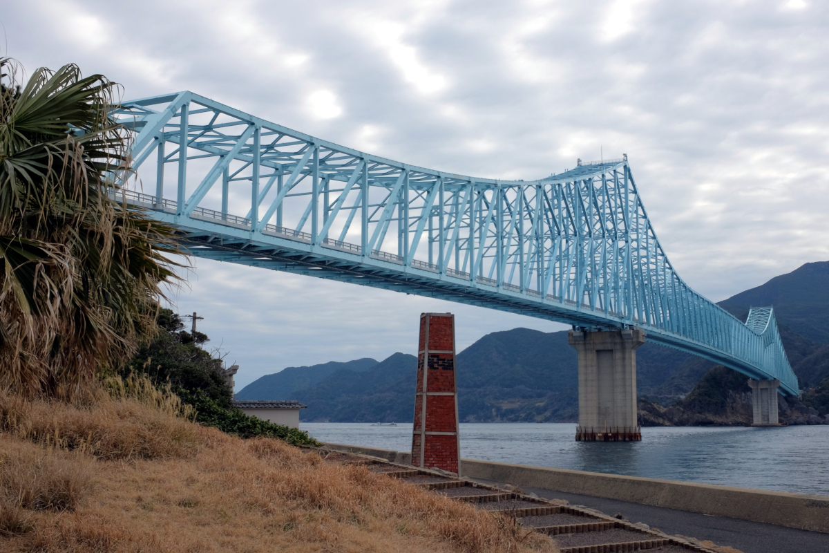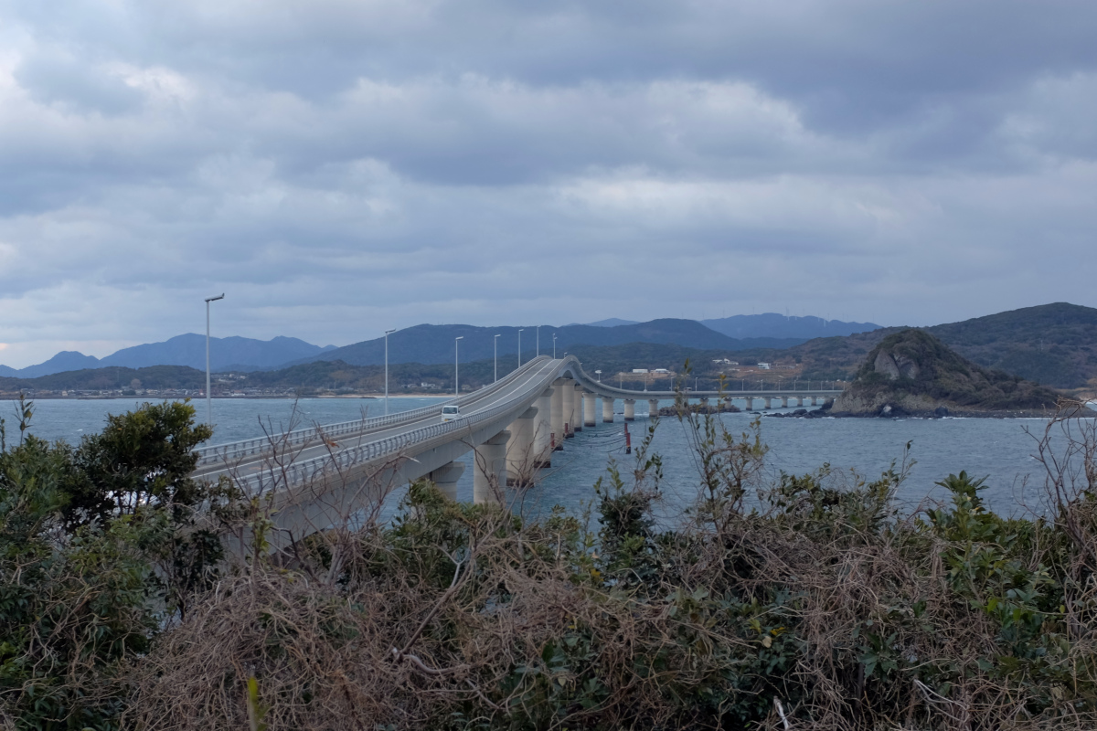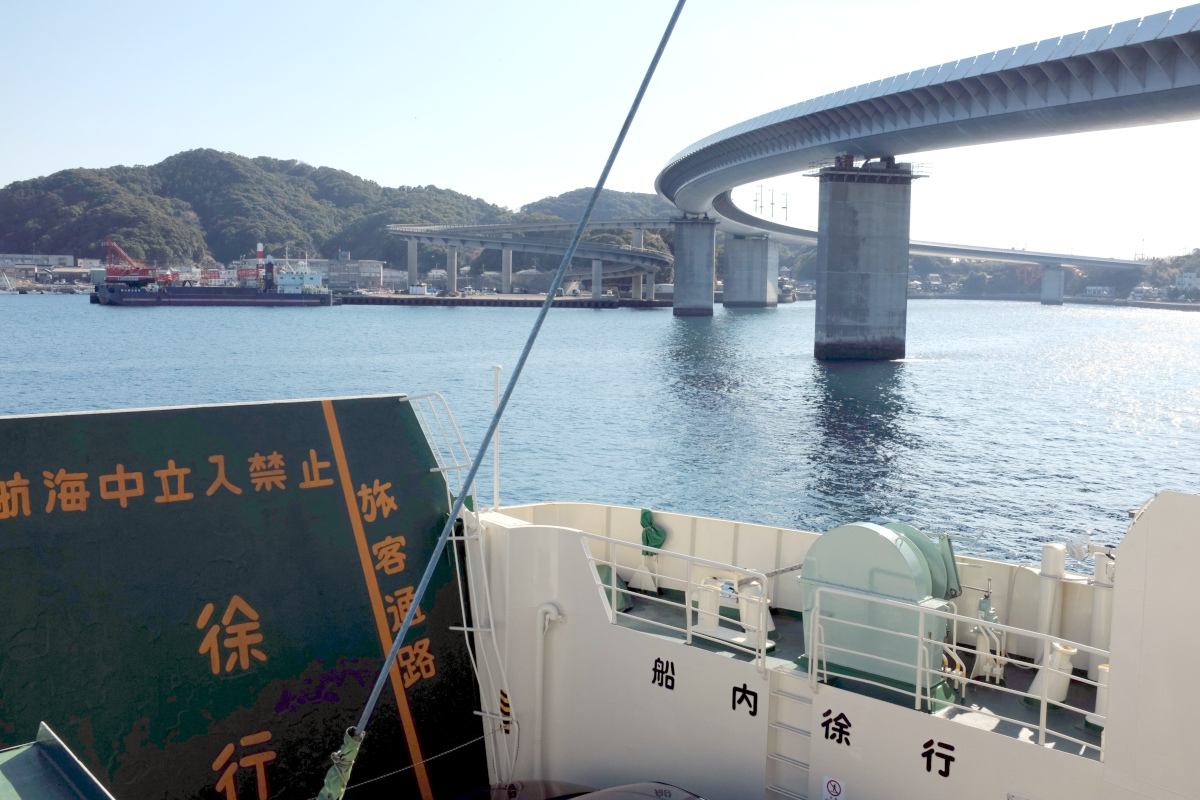で、どんどこ南下する。基本、海っぺりを走るのだが、それをガンバリすぎると、とんでもない酷い道を行くことになる場合があるので、その選択が難しい。その選択をいい感じにこなしつつ、海を横目に走っていると、次のフェリー乗り場に近づいてきた。最近の港には海上をパスする橋がある場合が多いが、この港にある牛深ハイヤ大橋は、橋上にT字路があったり、そこまでループで上ったりと面白い構成だ。うまく両方とも通過しつつ、フェリー乗り場に着く。よっしゃ。