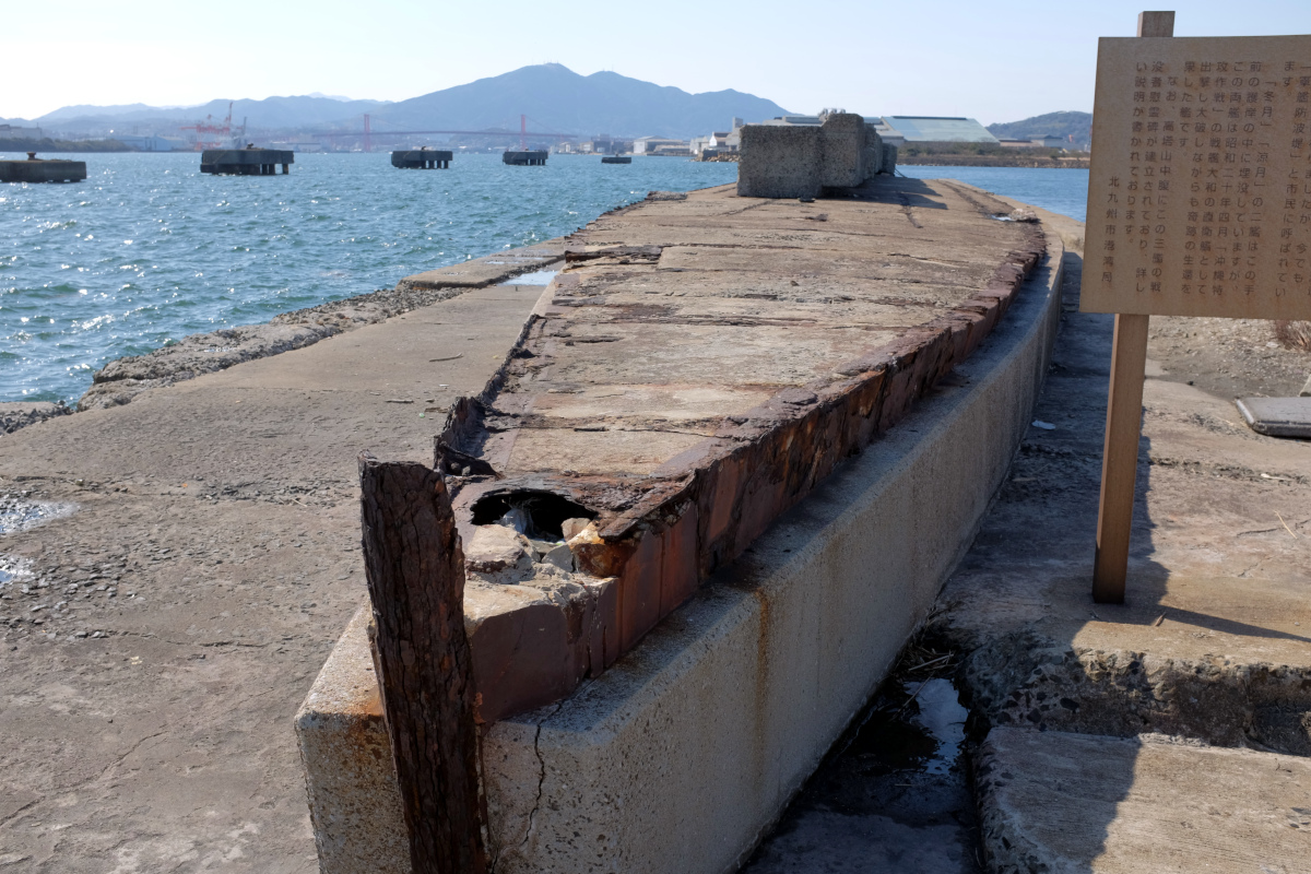 ようやく渋滞を抜け、若戸大橋を渡って軍艦防波堤に着く。おぉ、確かに軍艦の形そのままだ。大きさを体感できるがずいぶん小さいな。ここでサイコメトリ能力を持っていたら何かが見えただろうか……などといらんことを考えながら歩いていたら、足元にあった雨水の溜まったフライパンに気づかず、蹴っ飛ばして右足がびしょ濡れになってしまった。うげぇ。なんでそんなものがあんだよ。