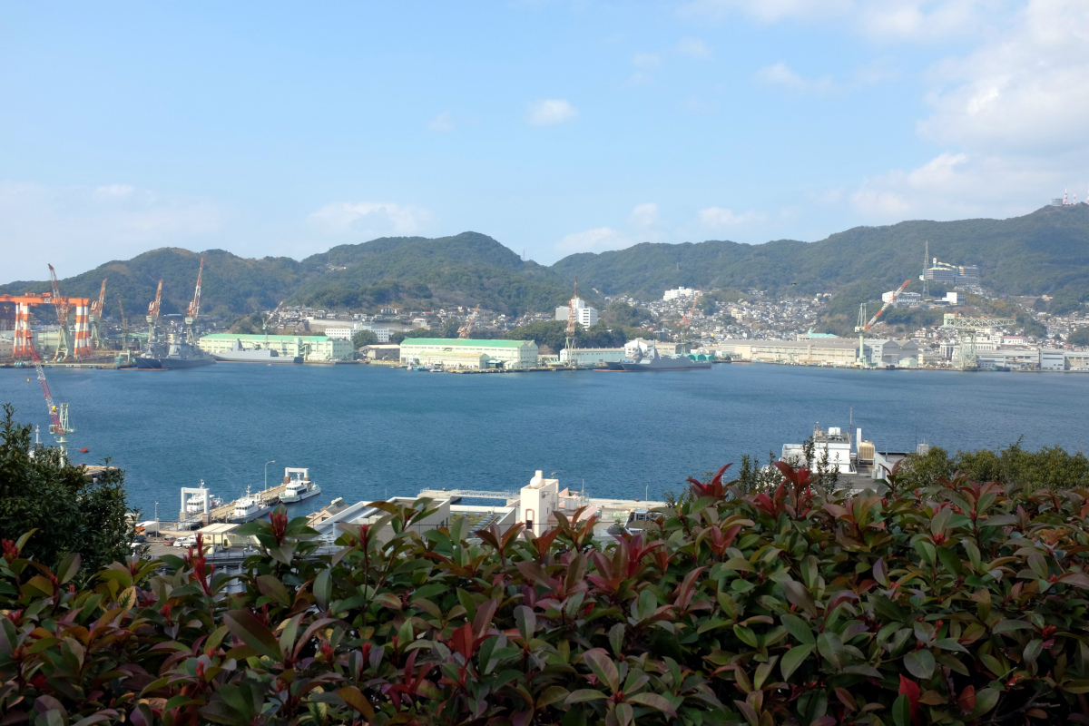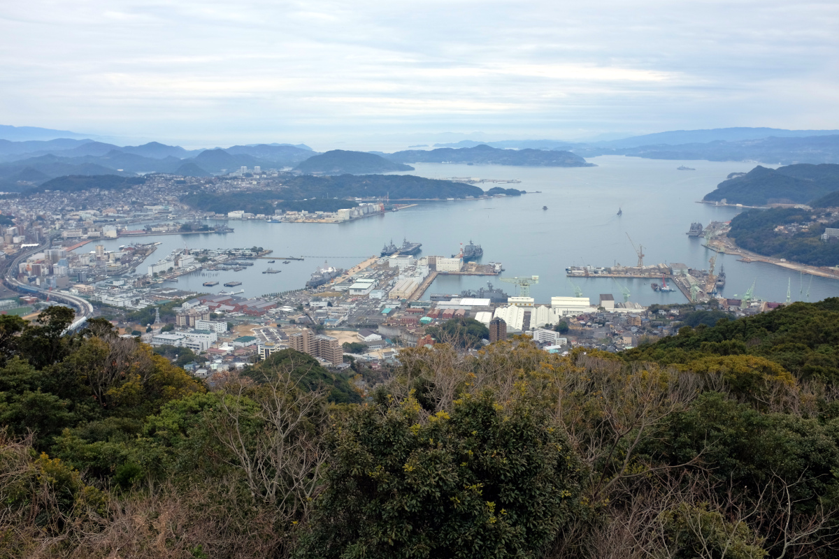 8時過ぎに出発。軍艦好き、近代史好きにとって佐世保と言えば戦艦武蔵である。吉村昭の小説によれば、港はすり鉢状の地形の中心にあり、周辺のどこからでも見下ろせてしまうので、秘匿のために大量のシュロの葉でドックを覆ったらしい。ドックは今も現役なので、自分も近くの山の上から見下ろしてみようと、当たりをつけた山に登ってみた。結果、鵜渡越展望所というところからでは港すら見えずで、もうひとつ奥の弓張岳展望台まで行ったら、港は見えたものの武蔵のドックは見えず、という感じだった。まぁ、そんなもんか。
