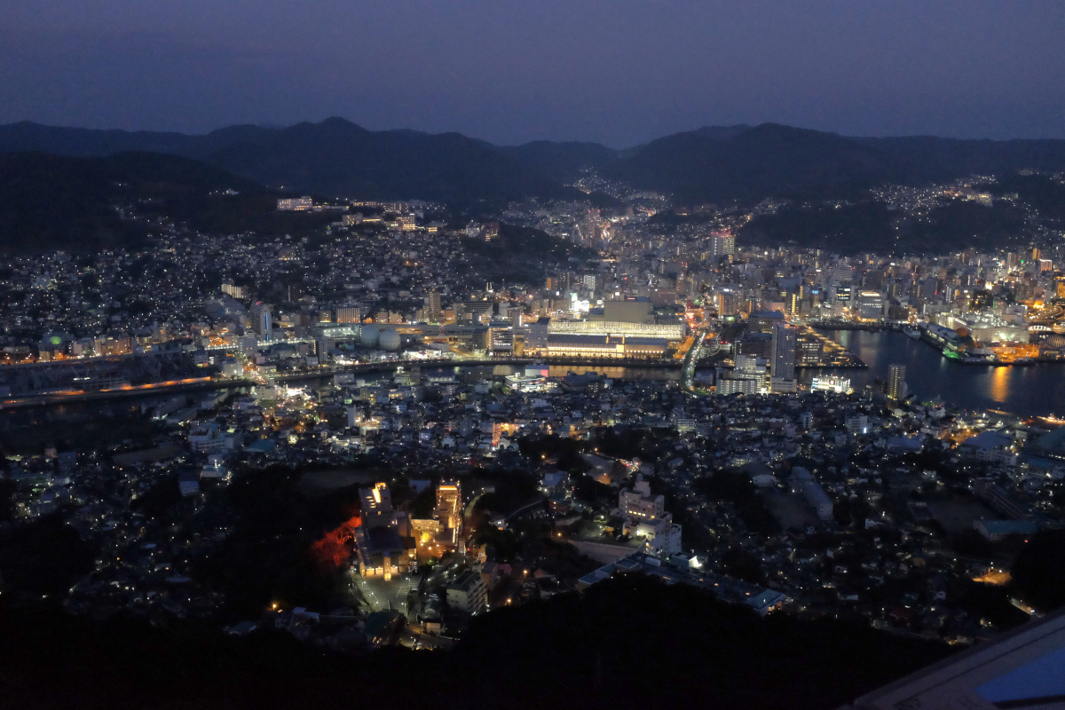 カフェで少し休憩して、北に戻る。ついでなので女神大橋を渡って、南から稲佐山公園へ登っていく。なかなかに微妙な道なのが楽しい。まだ明るいうちに稲佐山公園駐車場から歩いて展望台へ向かう。途中、鹿と猿にエサをやったり。展望台の中は暖かいが、外はどうにも風が強くて寒い。週末だから、結構な混雑度合いだ。ひととおり暗くなり、徐々に夜景が完成していくのを見る。本当にエラい狭いところに張り付いた行き止まりの街なんだだなぁ。帰りはスロープカーというのに乗って駐車場に戻って山を下りる。