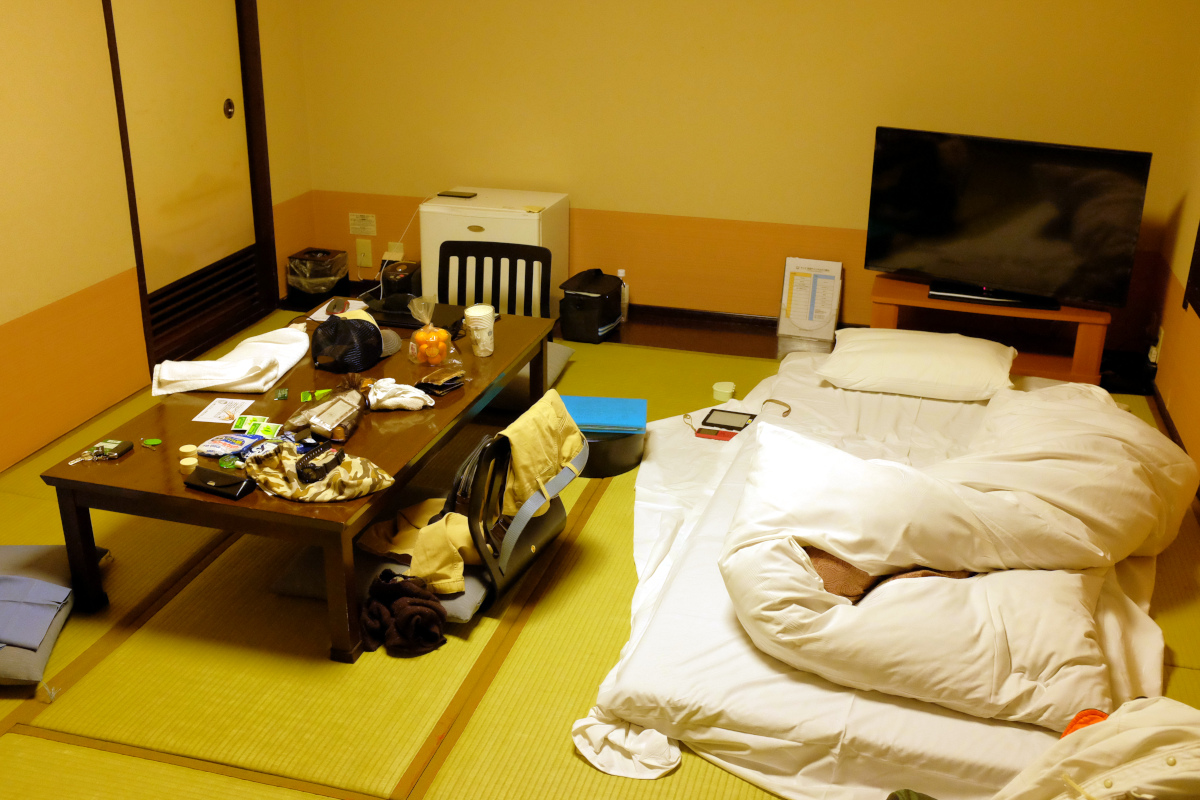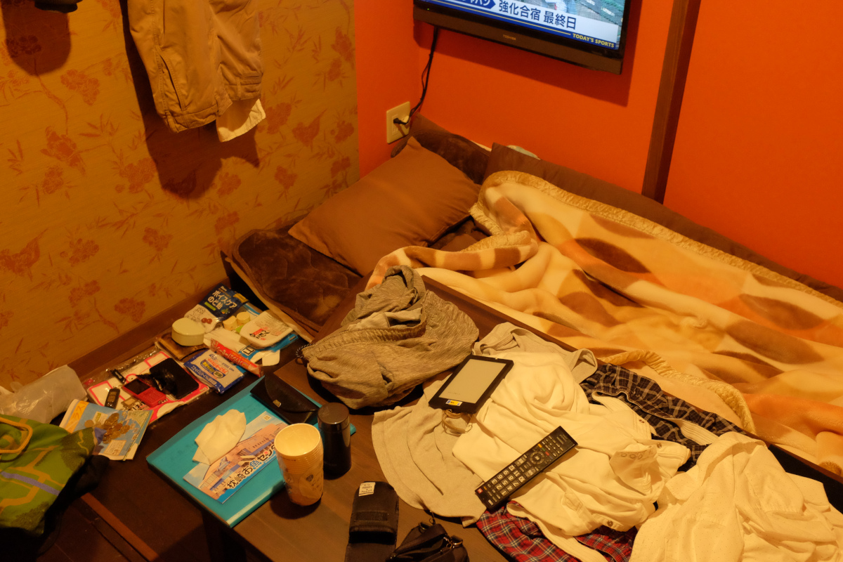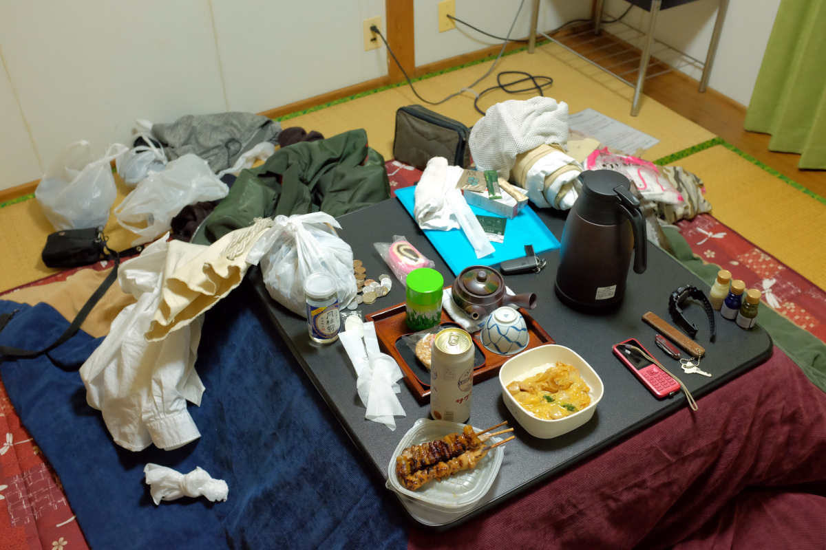 おぉ、しかしすごい宿だな。玄関を入った瞬間から硫黄の匂いがすごい。すぐにいい感じのおばあさんが出てきてチェックイン。元々は旅館ではなく湯治場ですからね、なんて説明もされつつ、晩飯を買うなら、西にはない、南に向かえばある、とのこと。早速、南に向かうが、だいぶ想像とスケール感が違い、コンビニまで10km弱もあった。適当に晩飯と朝飯を買って宿に戻る。