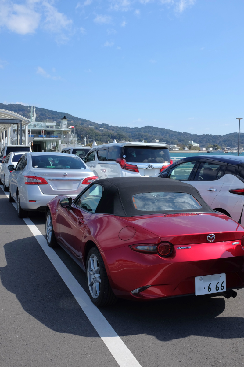 諫早市内まで戻って南下。雲仙を左に見て海っぺりを走る。そして遂に来ました。初のフェリー乗り場。人生で初じゃないかな。クルマと一緒に海を越えるのは。事前に乗り方についての情報をサイトで仕入れていたが、まずは一般駐車場へ駐めて……て、あれ? 予定よりひとつ前に乗れそう?