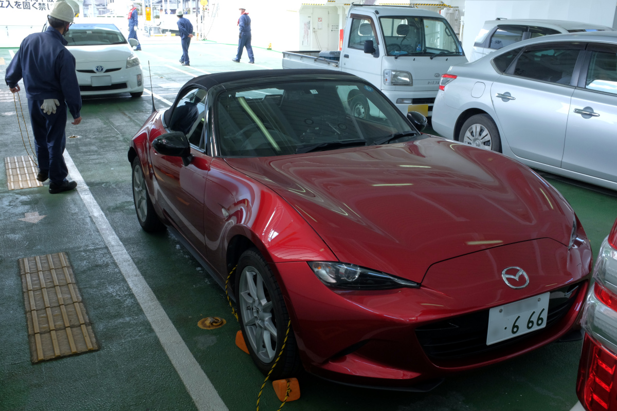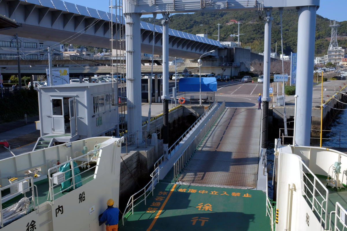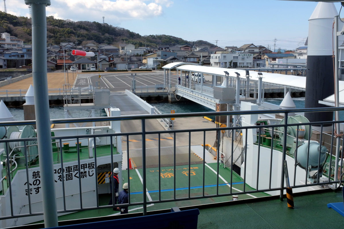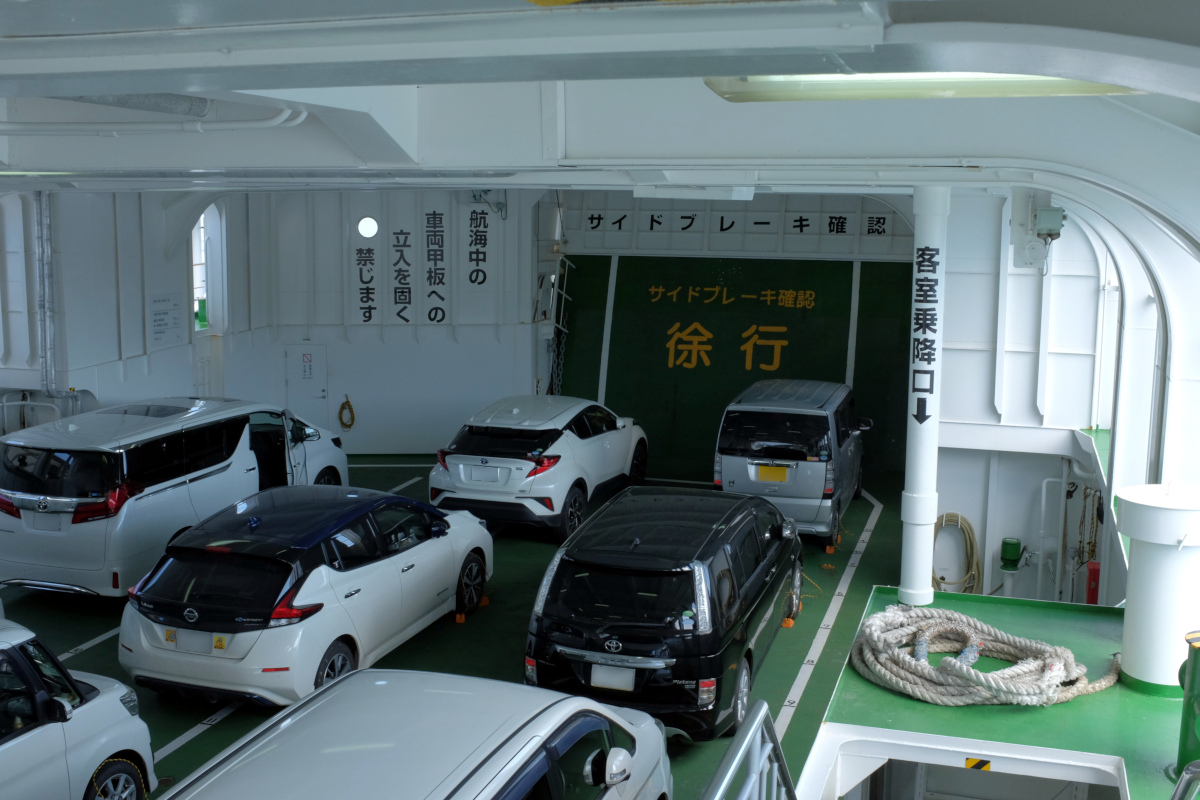 クルマを乗船用のレーンに並べ直し、係員に15分前までにクルマに戻ればいい旨を確認、事前に車検証を移しておいたクリアファイルを持って窓口へ。切符を買ってクルマに戻る。出航の15分前くらいに乗船が始まる。エンジンを始動し、窓を開けて切符を見せて、桟橋を渡ってフェリー船内へ。誘導に従ってクルマを駐めて、ちょっと強めにサイドブレーキを引く。係員の人が輪止めをセットしてくれる。一輪だけだし、エラく適当に見えるが。ちなみにフェリーは前後に口があるので、下船する時にバックする必要はない。世の中のすべてのフェリーがそうなのかは知らないが。